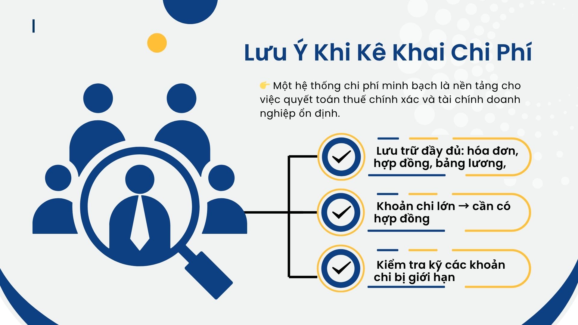 - Kiểm tra kỹ các khoản chi bị giới hạn hoặc cần kê khai rõ trong hồ sơ quyết toán thuế.