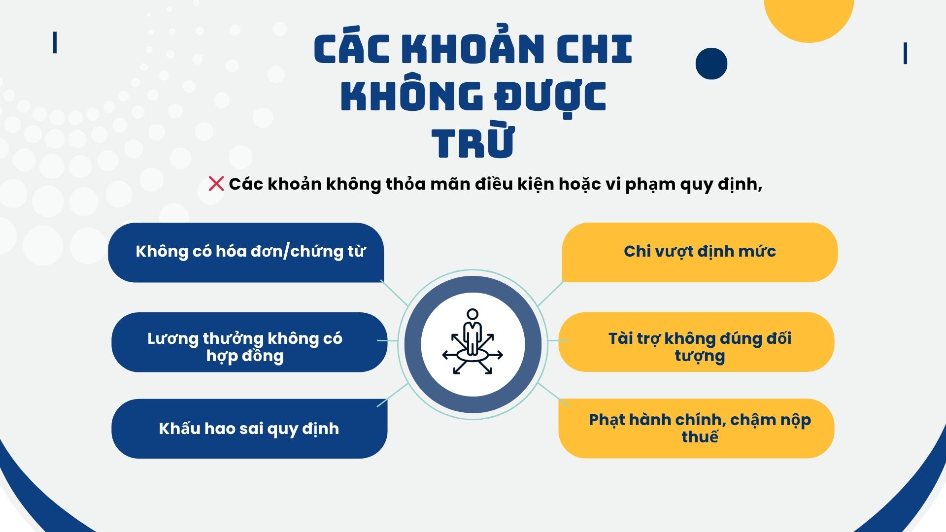 Theo quy định, các khoản chi không đáp ứng một trong ba điều kiện trên hoặc vi phạm các quy định cụ thể của pháp luật sẽ không được trừ. Một số ví dụ cụ thể như: