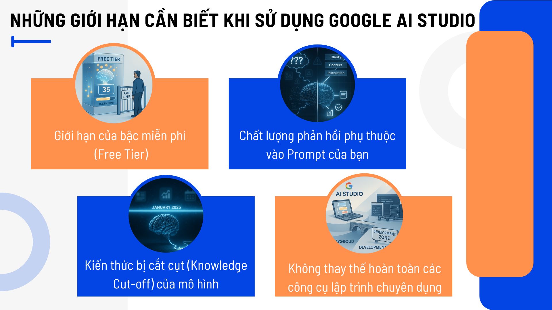 Bên cạnh những lợi ích to lớn, việc hiểu rõ các giới hạn của Google AI Studio sẽ giúp bạn có kỳ vọng thực tế và sử dụng công cụ hiệu quả hơn.
