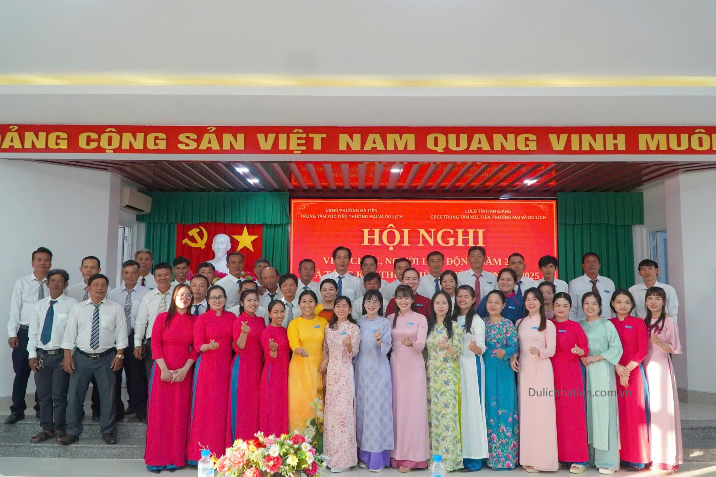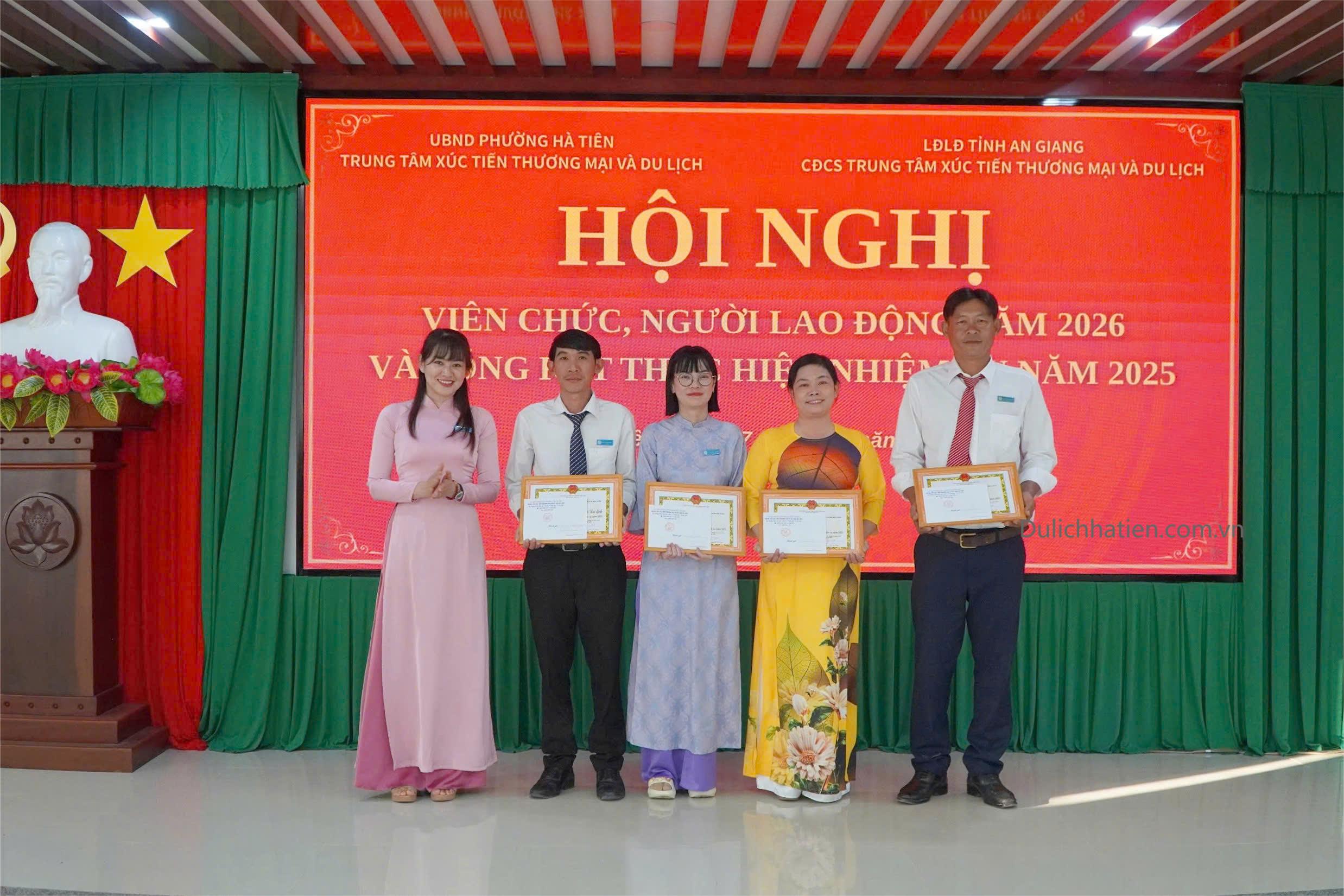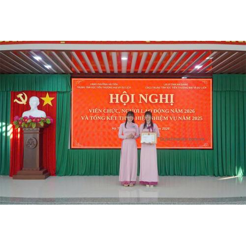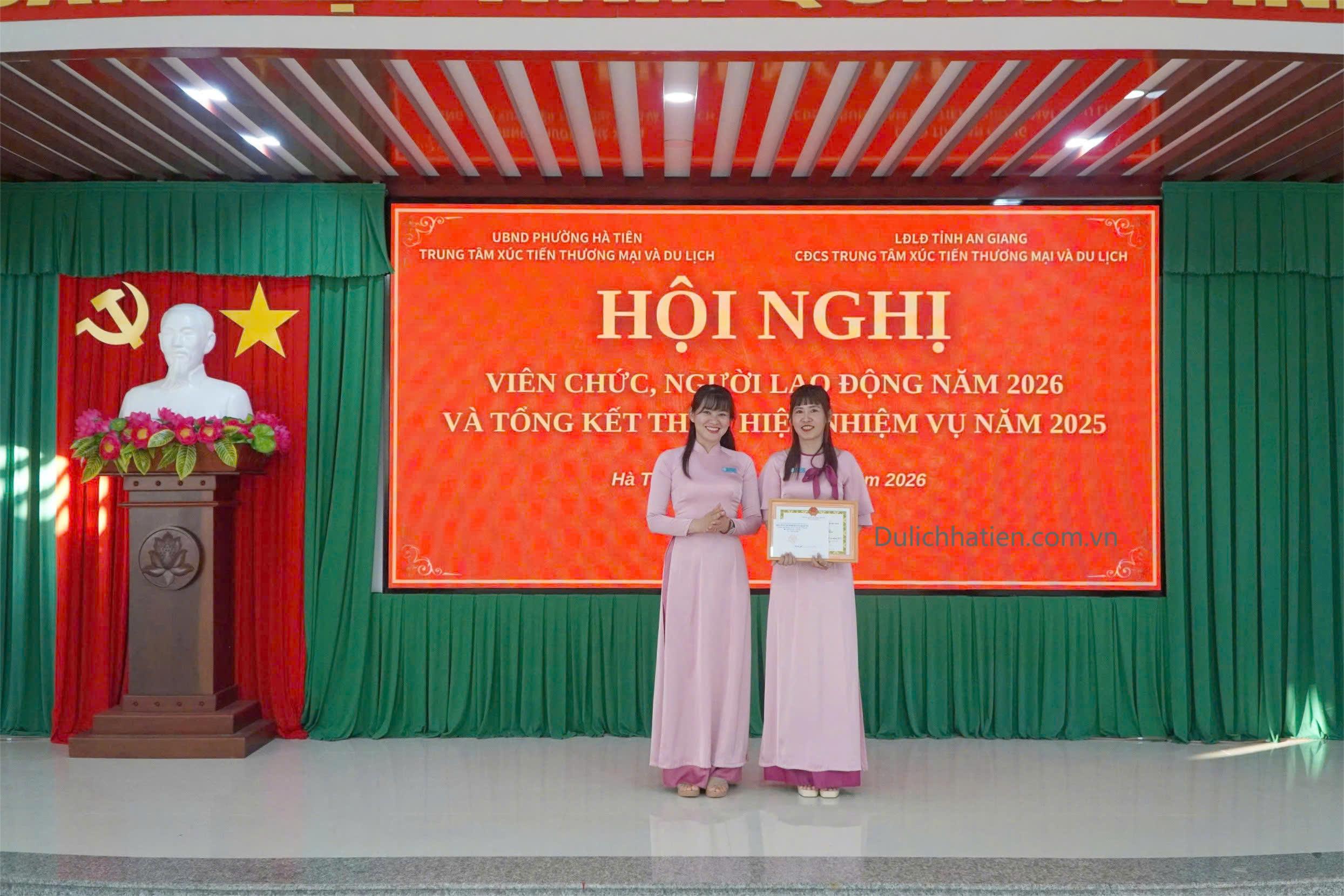 Chiều ngày 07/01, Trung tâm Xúc tiến Thương mại và Du lịch Hà Tiên tổ chức Hội nghị viên chức, người lao động năm 2026 và tổng kết thực hiện nhiệm vụ năm 2025. Tham dự hội nghị có các đồng chí: Nguyễn Thị Mộng Quyên - Bí thư Chi bộ, Giám đốc Trung tâm; Bùi Đăng Khoa - Phó Bí thư Chi bộ, Phó Giám đốc Trung tâm; Khưu Kim Yên - Phó Giám đốc Trung tâm, Chủ tịch Công đoàn cơ sở; Lý Trường Sang - Phó Giám đốc Trung tâm, cùng toàn thể viên chức, người lao động trong đơn vị.
