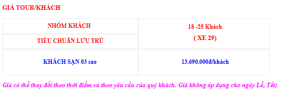 - Khách sạn 4 sao (phòng 2 hoặc 3 người) và các bữa ăn theo chương trình.