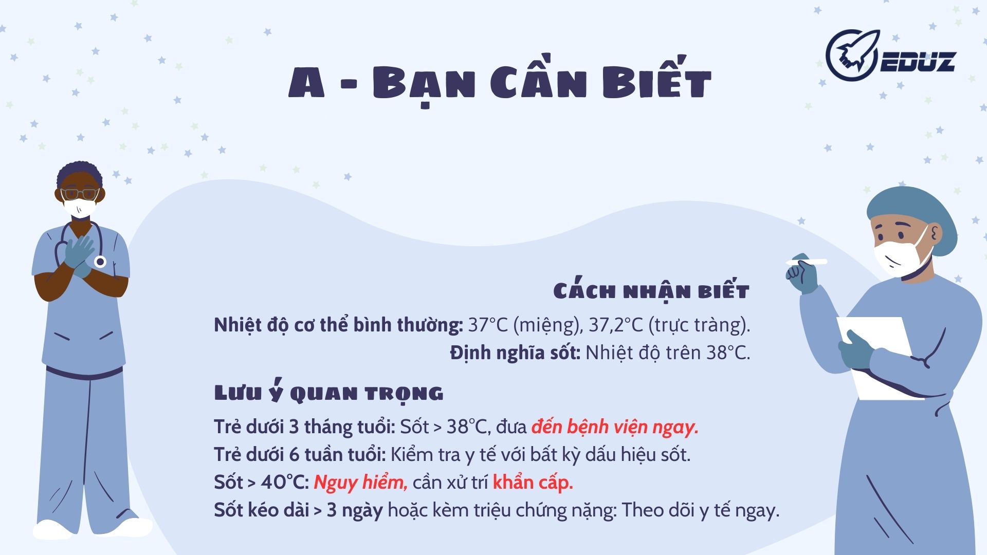 Nhiệt độ cơ thể bình thường dao động từ 37°C (đo ở miệng) đến 37,2°C (đo ở trực tràng). Sốt được định nghĩa là nhiệt độ cơ thể vượt trên 38°C. Một số điểm cần lưu ý: