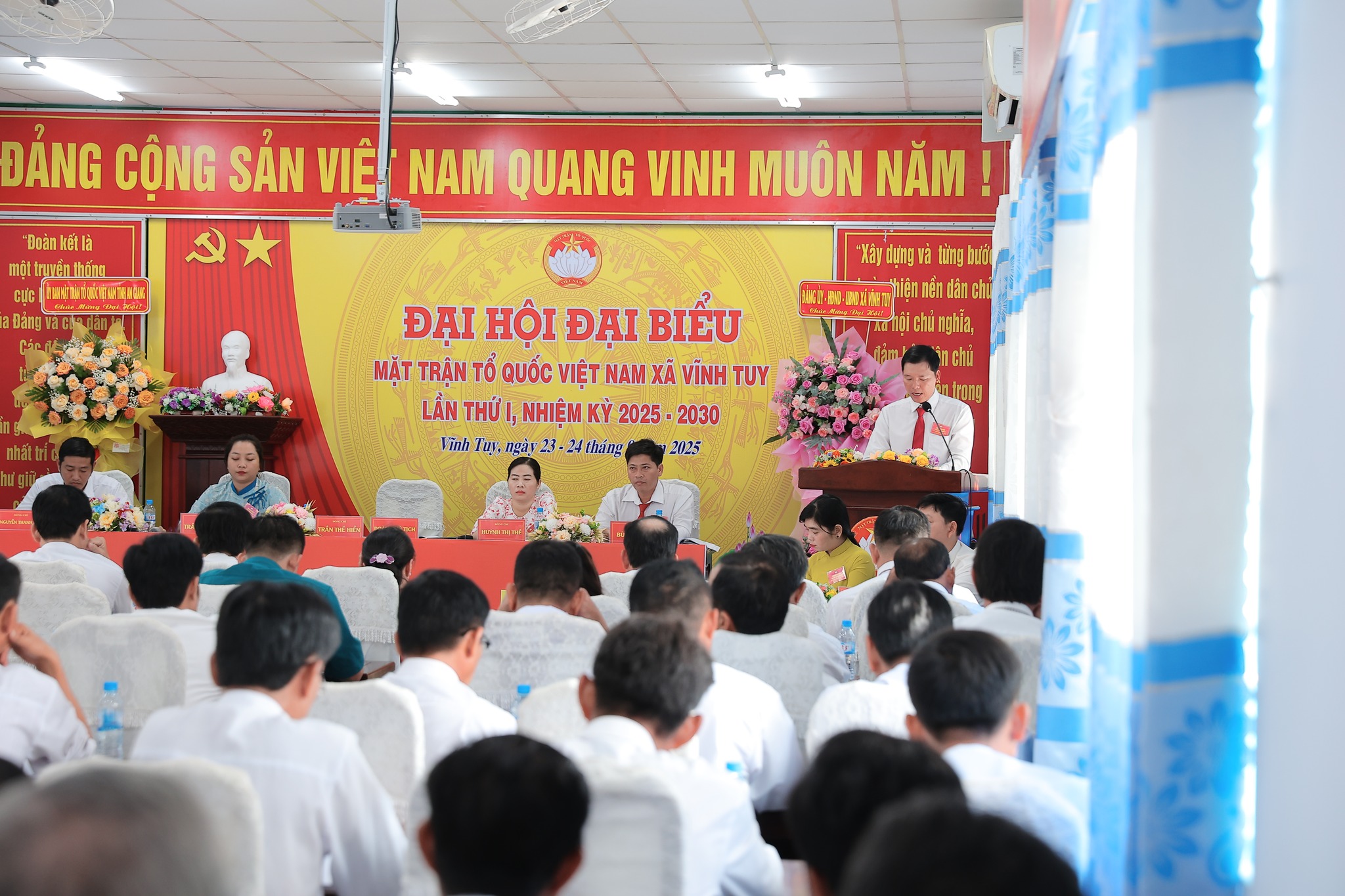 Chiều 23/9/2025, Đại hội đại biểu Mặt trận Tổ quốc Việt Nam xã Vĩnh Tuy lần thứ VI, nhiệm kỳ 2025 - 2030 đã khai mạc phiên làm việc thứ nhất. Đến dự Đại hội có đồng chí Nguyễn Xuân Hoài- Bí thư Đảng ủy, Chủ tịch HĐND xã; đồng chí Nguyễn Thanh Hiền- Phó Bí thư Đảng ủy, Trưởng Ban chỉ đạo Đại hội đại biểu MTTQ Việt Nam xã nhiệm kỳ 2025- 2030; đồng chí Nguyễn Thị Hồng Đoan- UV. BTV Đảng ủy, Phó Chủ tịch HĐND xã; đồng chí Tô Hải Đăng- UV.BTV Đảng ủy, Phó Chủ tịch UBND xã, ngoài ra Đại hội còn đón tiếp các đồng chí UV. BTV Đảng ủy xã, các đồng chí thành viên BCĐ Đại hội MTTQ Việt Nam xã, đặc biệt sự có mặt của 85/85 đại biểu chính thức đại diện cho các giới, các tôn giáo, trí thức và các tầng lớp nhân dân là những cá nhân tiêu biểu cho khối đại đoàn kết toàn dân tộc trên địa bàn xã.Tại phiên thứ nhất, Đại hội đã hiệp thương chọn cử Đoàn Chủ tịch gồm 05 vị, Đoàn Thư ký Đại hội 02 vị; thông qua chương trình làm việc; nội quy; quy chế của Đại hội; trình bày báo cáo tình hình Đại biểu về dự Đại hội; trình bày Báo cáo kết quả triển khai thực hiện Nghị quyết nhiệm kỳ 2024 – 2029 và phương hướng, nhiệm vụ nhiệm kỳ 2025 – 2030; Báo cáo kiểm điểm của Ủy ban và Ban Thường trực Ủy ban MTTQ Việt Nam xã nhiệm kỳ 2024- 2029 đến thời điểm hiện tại; Báo cáo tổng hợp ý kiến đóng góp dự thảo văn kiện Đại hội đại biểu MTTQ Việt Nam tỉnh An Giang nhiệm kỳ 2025-2030, văn kiện Đại hội đại biểu MTTQ Việt Nam và ý kiến đề nghị sửa đổi Điều lệ MTTQ Việt Nam.Với tinh thần làm việc nghiêm túc, khoa học, đoàn kết phiên làm việc thứ nhất Đại hội đã hoàn thành các nội dung quan trọng tạo tiền đề cho phiên chính thức của Đại hội diễn ra vào sáng ngày 24/9/2025 thành công tốt đẹp.