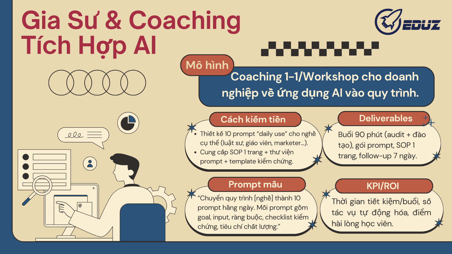 Mô hình: Coaching 1-1/Workshop cho doanh nghiệp về ứng dụng AI vào quy trình.
