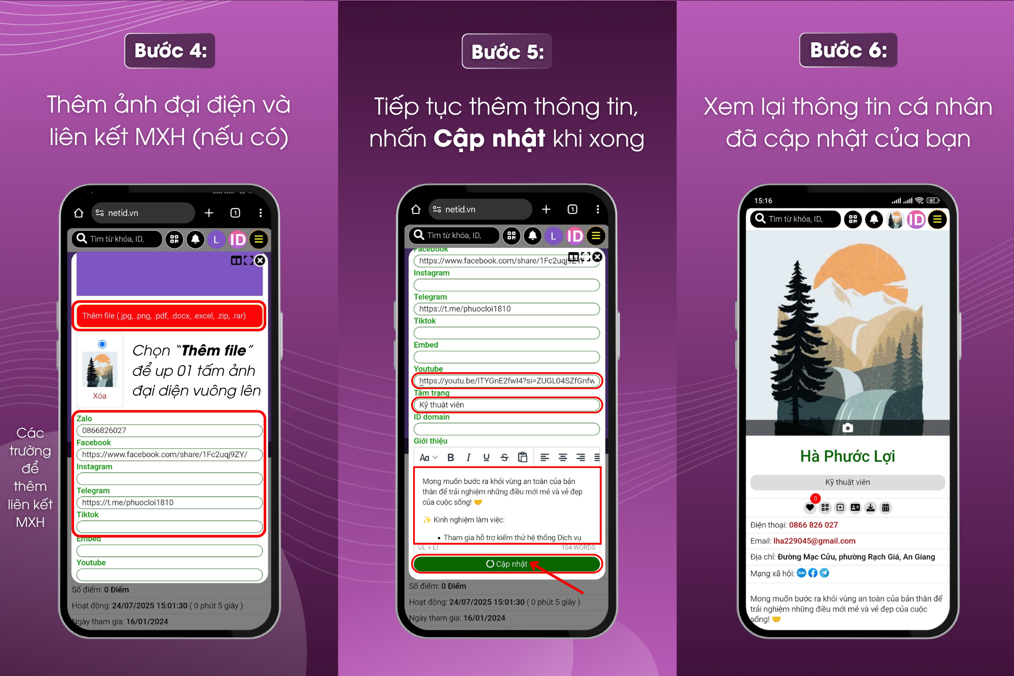 Bước 6: Kiểm tra lại thông tin cá nhân đã cập nhật. (Lặp lại thao tác ban đầu để chỉnh sửa thông tin nếu cần)