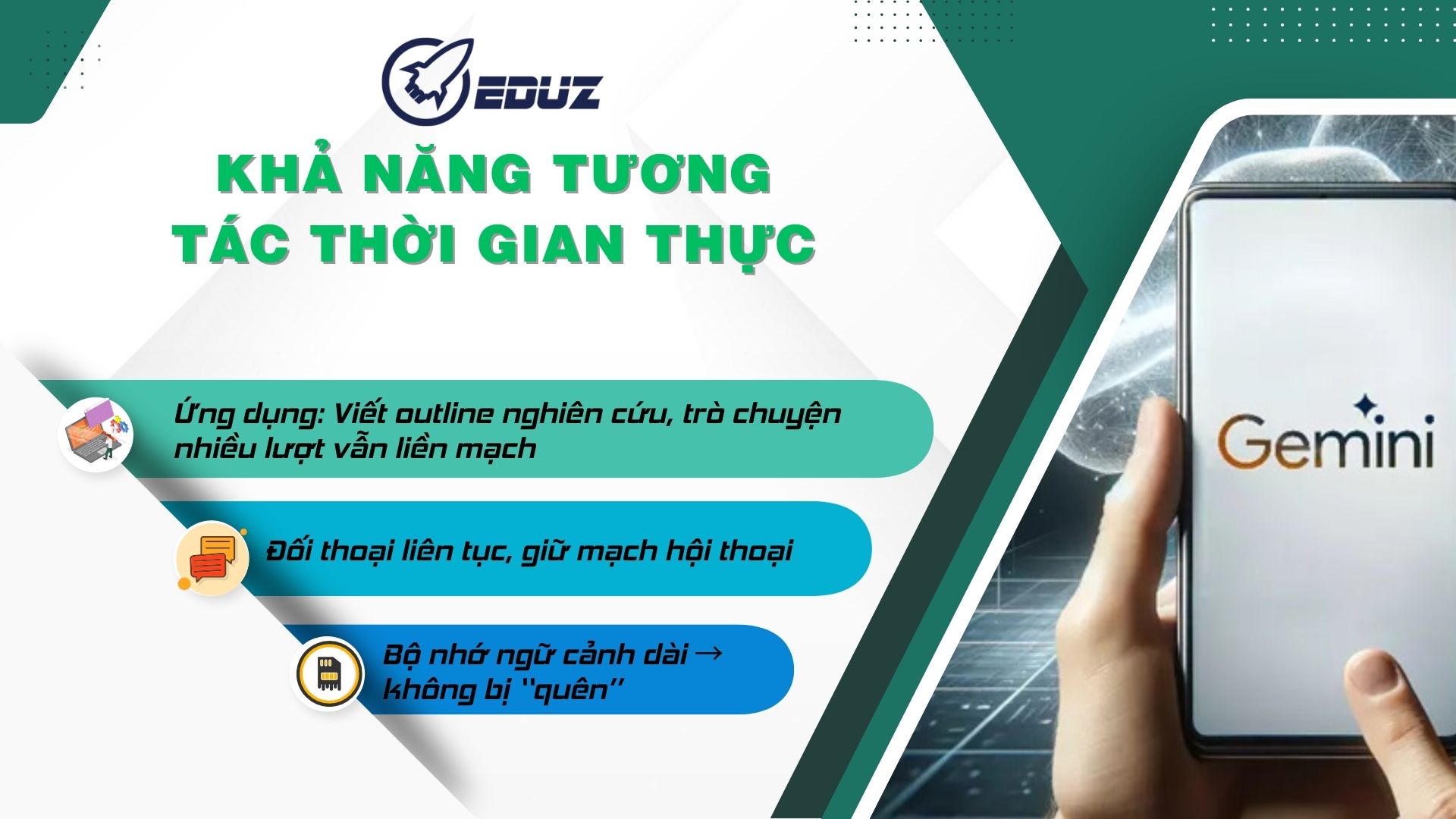 Khác biệt lớn của Gemini là khả năng đối thoại liên tục. Bạn không cần nhập câu hỏi hoàn hảo – chỉ cần trò chuyện, Gemini vẫn hiểu ngữ cảnh và tiếp nối mạch hội thoại.