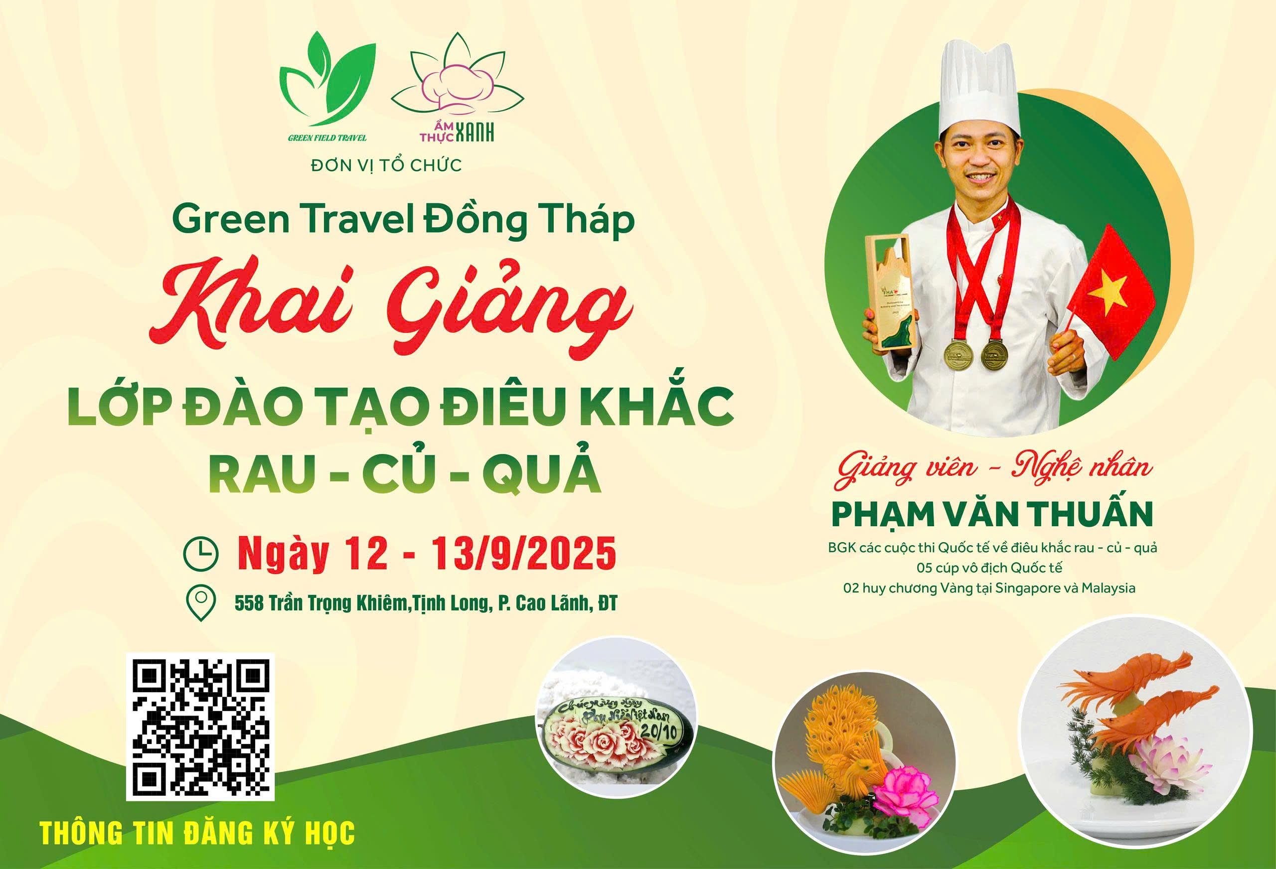 Green Travel Đồng Tháp chính thức khai giảng khóa học “Điêu khắc rau, củ, quả – Nâng tầm món ăn Việt”, mang đến cho học viên những trải nghiệm thực tế và kỹ năng hữu ích trong ẩm thực và nghệ thuật.