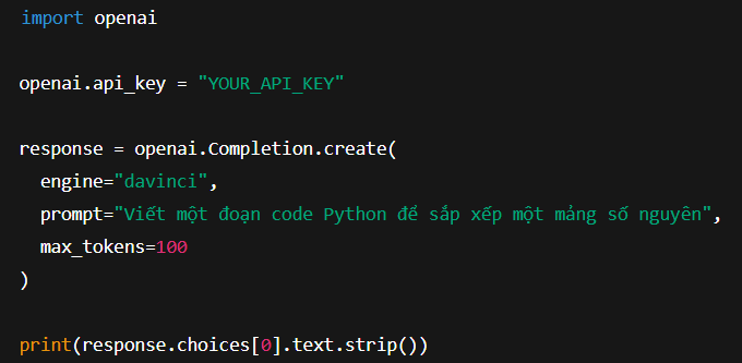 Cài đặt thư viện: Ví dụ với Python, chỉ cần pip install openai.