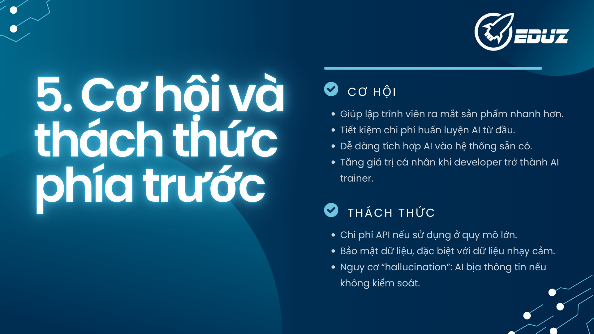 Nhưng với mô hình ngôn ngữ lớn (LLM) như ChatGPT và API của OpenAI, mọi thứ đã thay đổi. Lập trình viên không cần huấn luyện từ con số 0, mà có thể tận dụng mô hình được đào tạo sẵn rồi tùy chỉnh cho mục đích riêng. Đây chính là bước đột phá giúp tiết kiệm thời gian, công sức và chi phí.