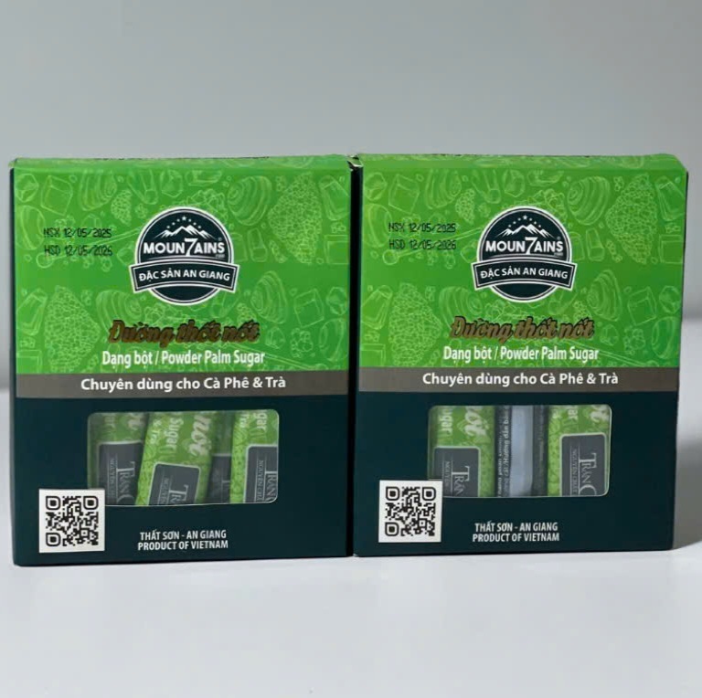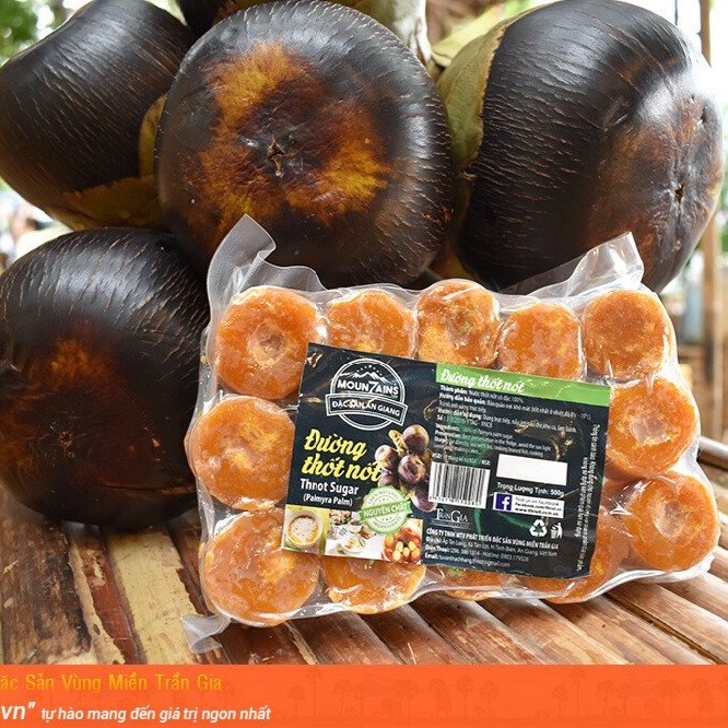 Đường thốt nốt Trần Gia sản xuất thủ công từ vùng An Giang, bao bì chuyên nghiệp, có thông tin nhà sản xuất, ngày sản xuất, thành phần, cách dùng, hạn sử dụng được in ấn rõ ràng.