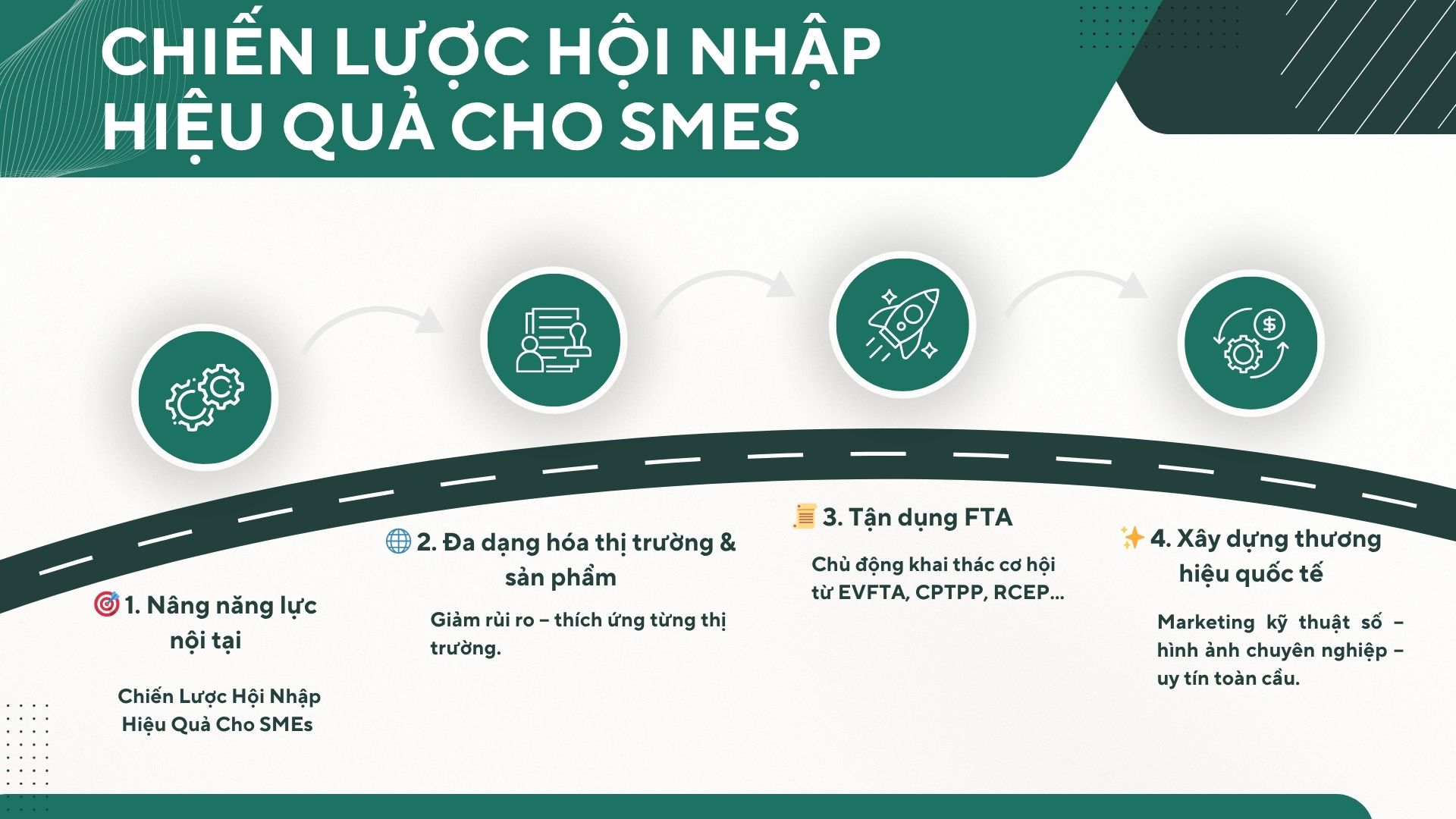Để hội nhập thành công, SMEs cần xây dựng những chiến lược phù hợp với đặc thù ngành nghề và năng lực nội tại. Một số chiến lược thiết thực bao gồm: