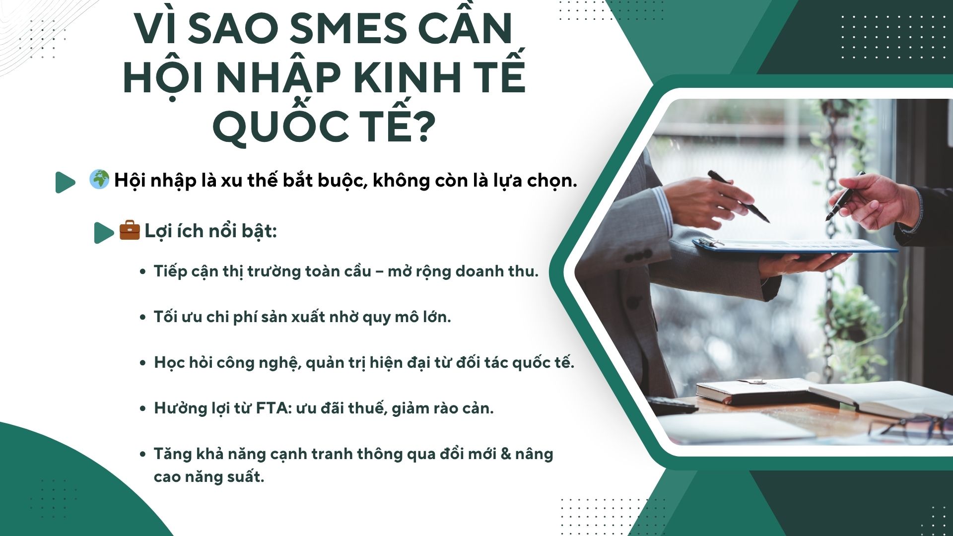 Hội nhập không còn là lựa chọn mà là xu thế bắt buộc trong thời đại toàn cầu hóa. Với SMEs, hội nhập giúp doanh nghiệp vươn ra khỏi biên giới quốc gia để tiếp cận thị trường quốc tế rộng lớn, nơi tiềm năng tiêu dùng và cơ hội hợp tác cao hơn rất nhiều so với thị trường nội địa. Qua đó, doanh nghiệp có thể gia tăng doanh thu, tối ưu hóa chi phí sản xuất nhờ quy mô lớn, và học hỏi kinh nghiệm quản trị tiên tiến từ các đối tác quốc tế.