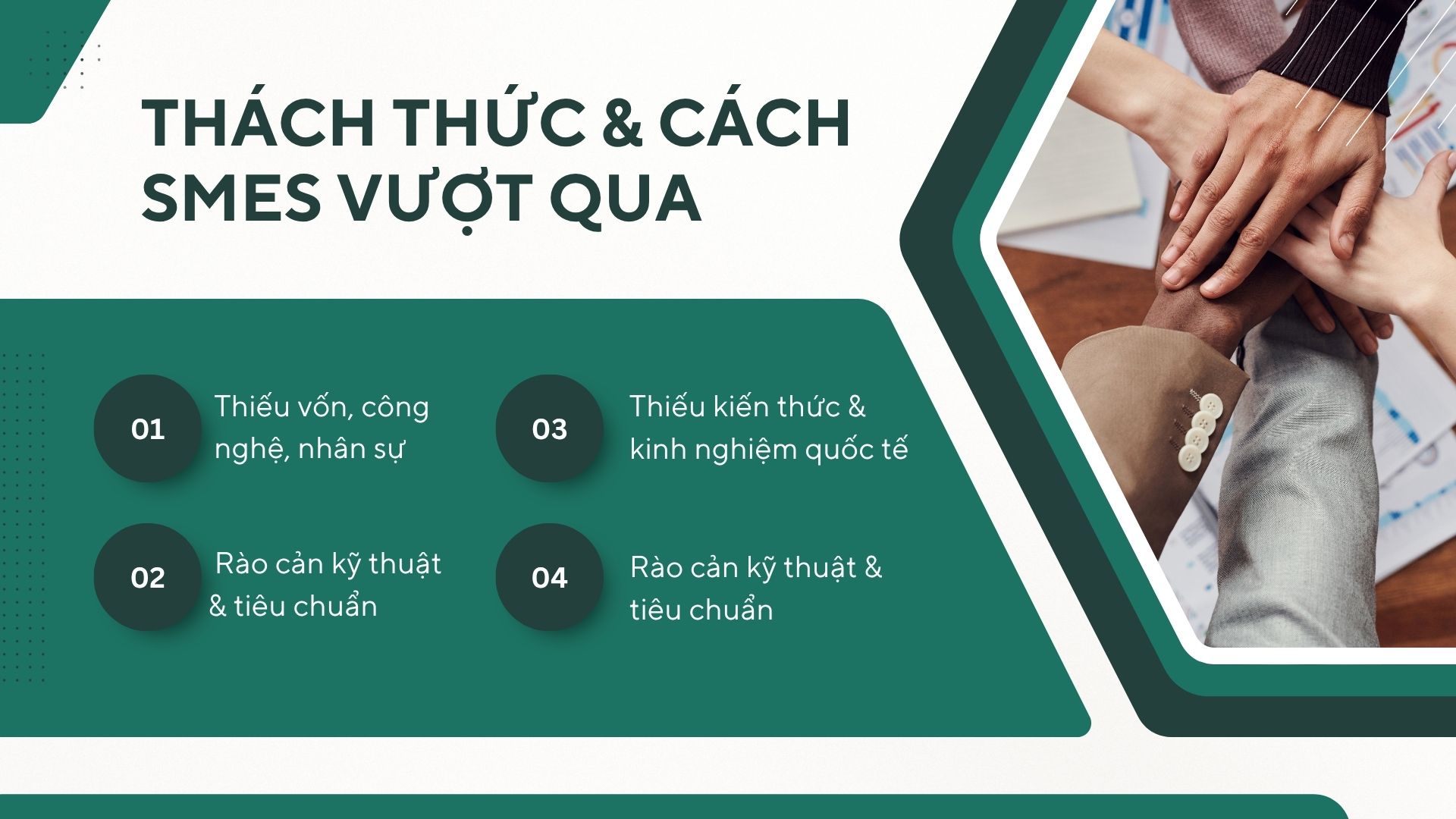 Nhiều SMEs chưa hiểu rõ về luật lệ quốc tế, văn hóa kinh doanh nước ngoài và quy trình xuất nhập khẩu. Giải pháp là tích cực tham gia các khóa đào tạo, hội chợ thương mại quốc tế và chương trình cố vấn doanh nghiệp. - Rào cản kỹ thuật và tiêu chuẩn chất lượng: