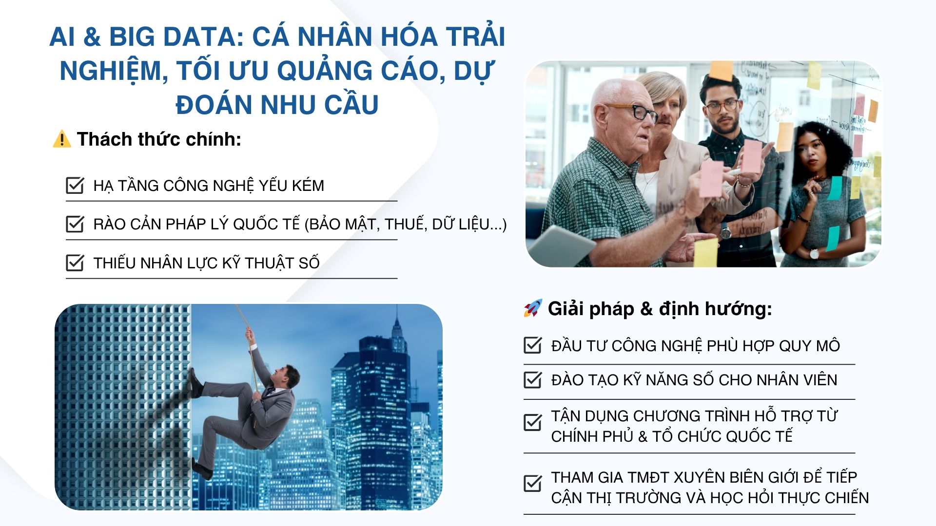 - Ứng dụng AI và dữ liệu lớn: Tối ưu hóa quảng cáo, cá nhân hóa trải nghiệm khách hàng, và dự đoán nhu cầu thị trường với độ chính xác cao.