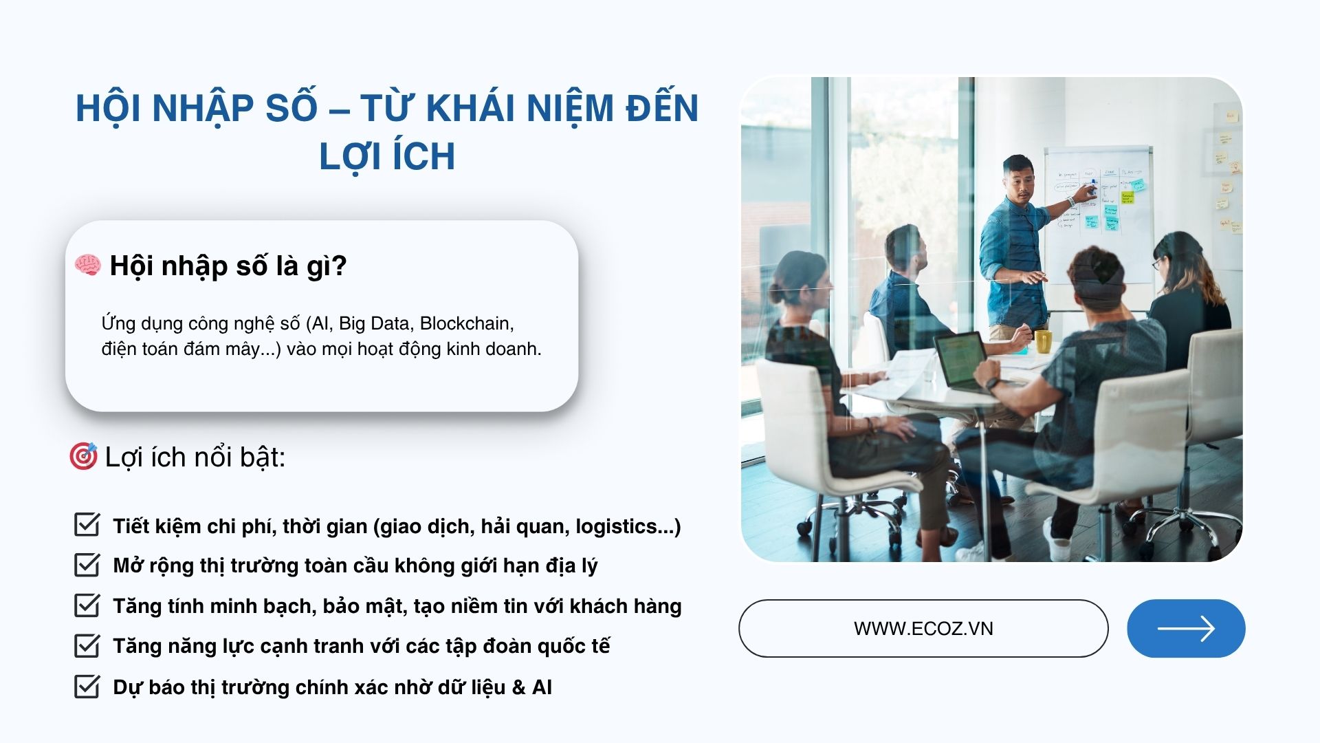 Hội nhập số là quá trình ứng dụng công nghệ hiện đại như điện toán đám mây, dữ liệu lớn (Big Data), trí tuệ nhân tạo (AI), blockchain… vào toàn bộ hoạt động kinh doanh, từ sản xuất, tiếp thị đến xuất nhập khẩu.