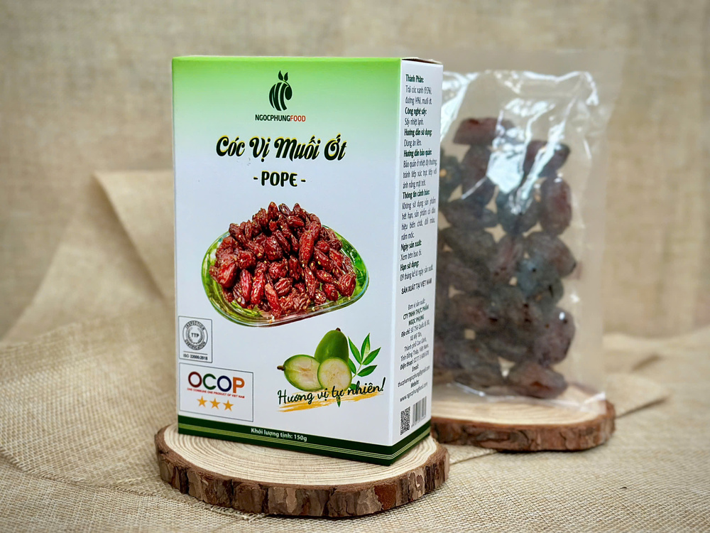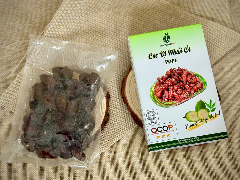 Cóc Vị Muối Ớt – Hộp 150gr là một sản phẩm đạt chứng nhận OCOP 3 sao, thể hiện sự cam kết về chất lượng và an toàn thực phẩm. Sản phẩm được chế biến từ trái cóc xanh tươi ngon, kết hợp với vị muối ớt cay nồng, tạo nên một món ăn vặt hấp dẫn, vừa thơm ngon vừa bổ dưỡng. Với quy trình sấy nhiệt lạnh tiên tiến, cóc vị muối ớt giữ nguyên được hương vị tự nhiên, độ giòn đặc trưng của cóc, đồng thời gia tăng hương vị với chút cay cay, mặn mà của muối ớt.