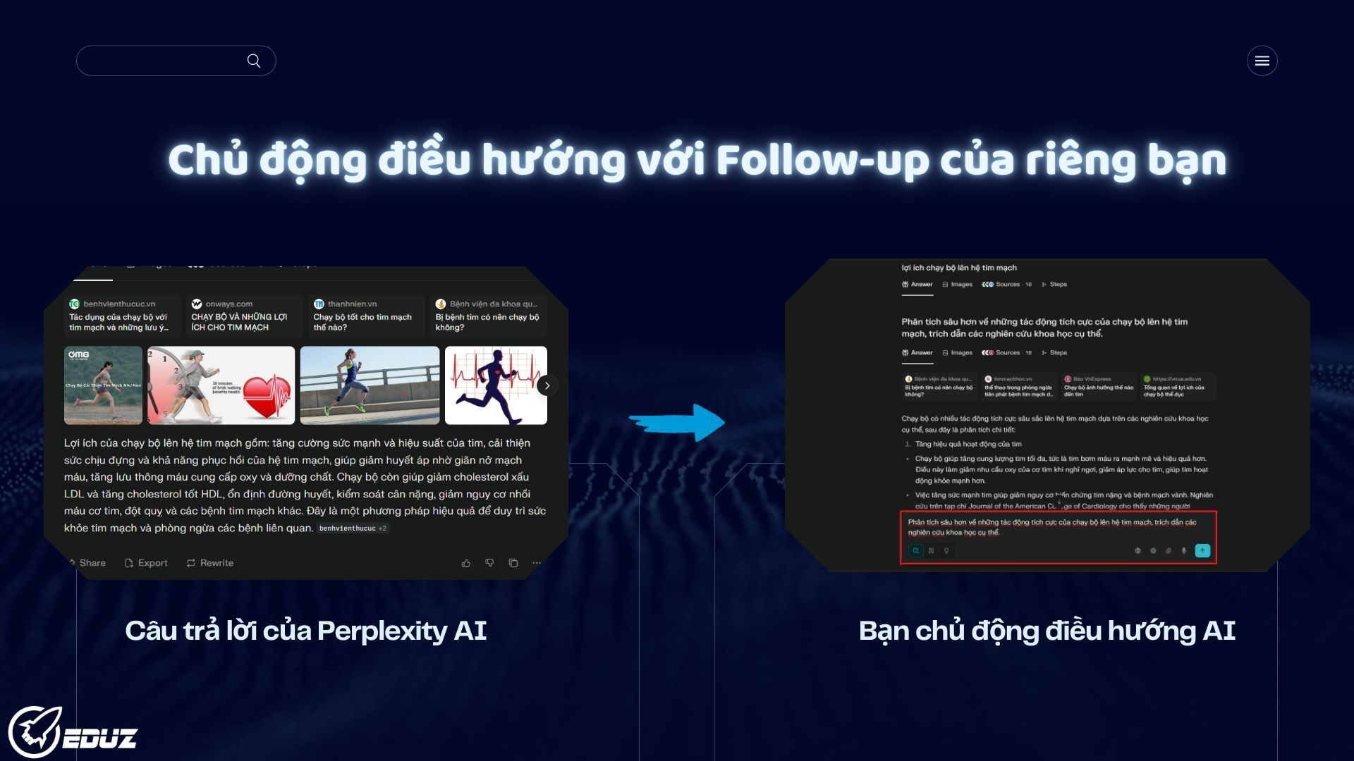 Ví dụ: Giả sử Perplexity AI trả lời về lợi ích chạy bộ lên hệ tim mạch. Tôi sẽ viết "Follow-up" của riêng mình: "Phân tích sâu hơn về những tác động tích cực của chạy bộ lên hệ tim mạch, trích dẫn các nghiên cứu khoa học cụ thể."