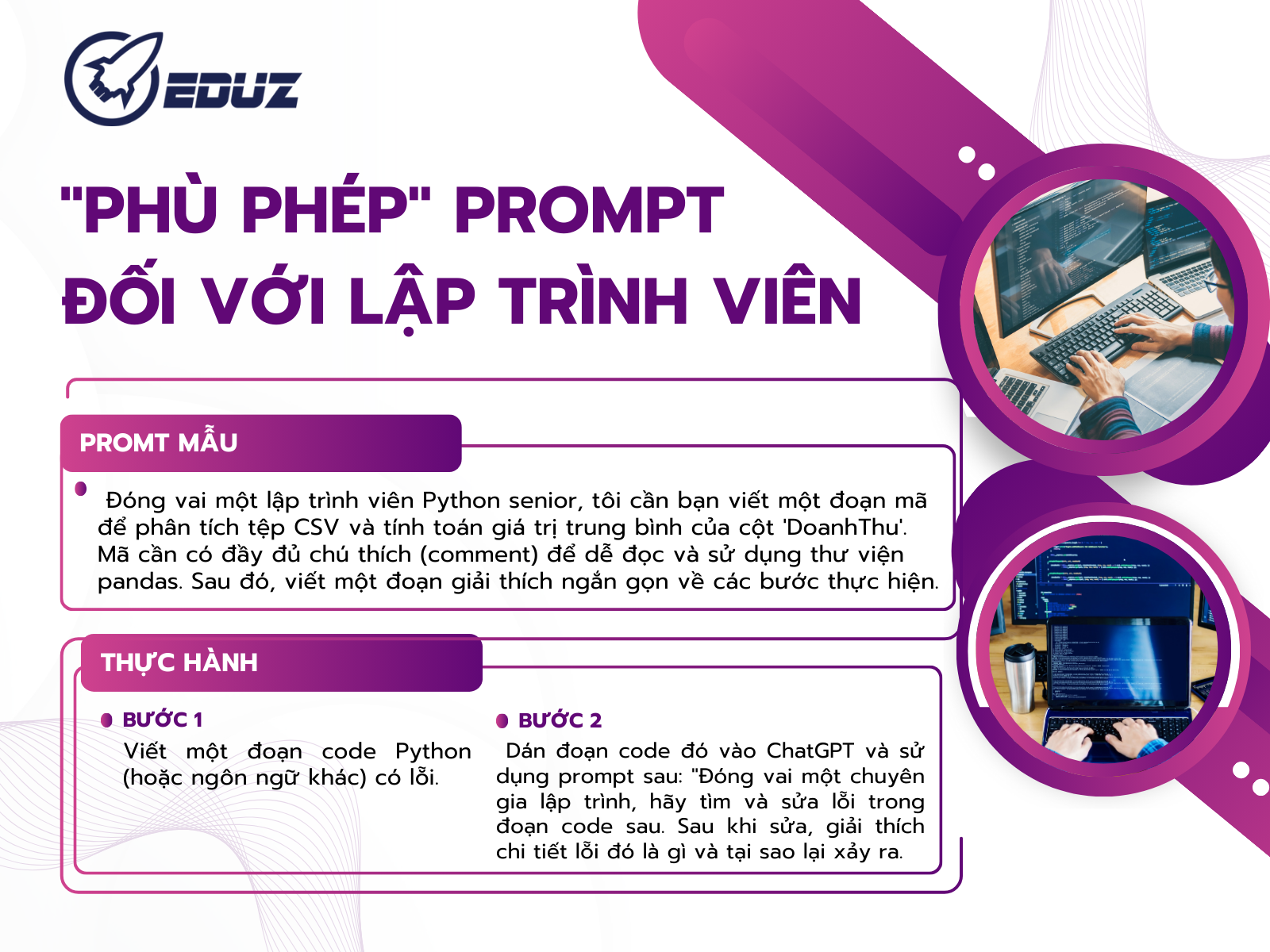 Prompt mẫu: "Đóng vai một lập trình viên Python senior, tôi cần bạn viết một đoạn mã để phân tích tệp CSV và tính toán giá trị trung bình của cột 'DoanhThu'. Mã cần có đầy đủ chú thích (comment) để dễ đọc và sử dụng thư viện pandas. Sau đó, viết một đoạn giải thích ngắn gọn về các bước thực hiện."