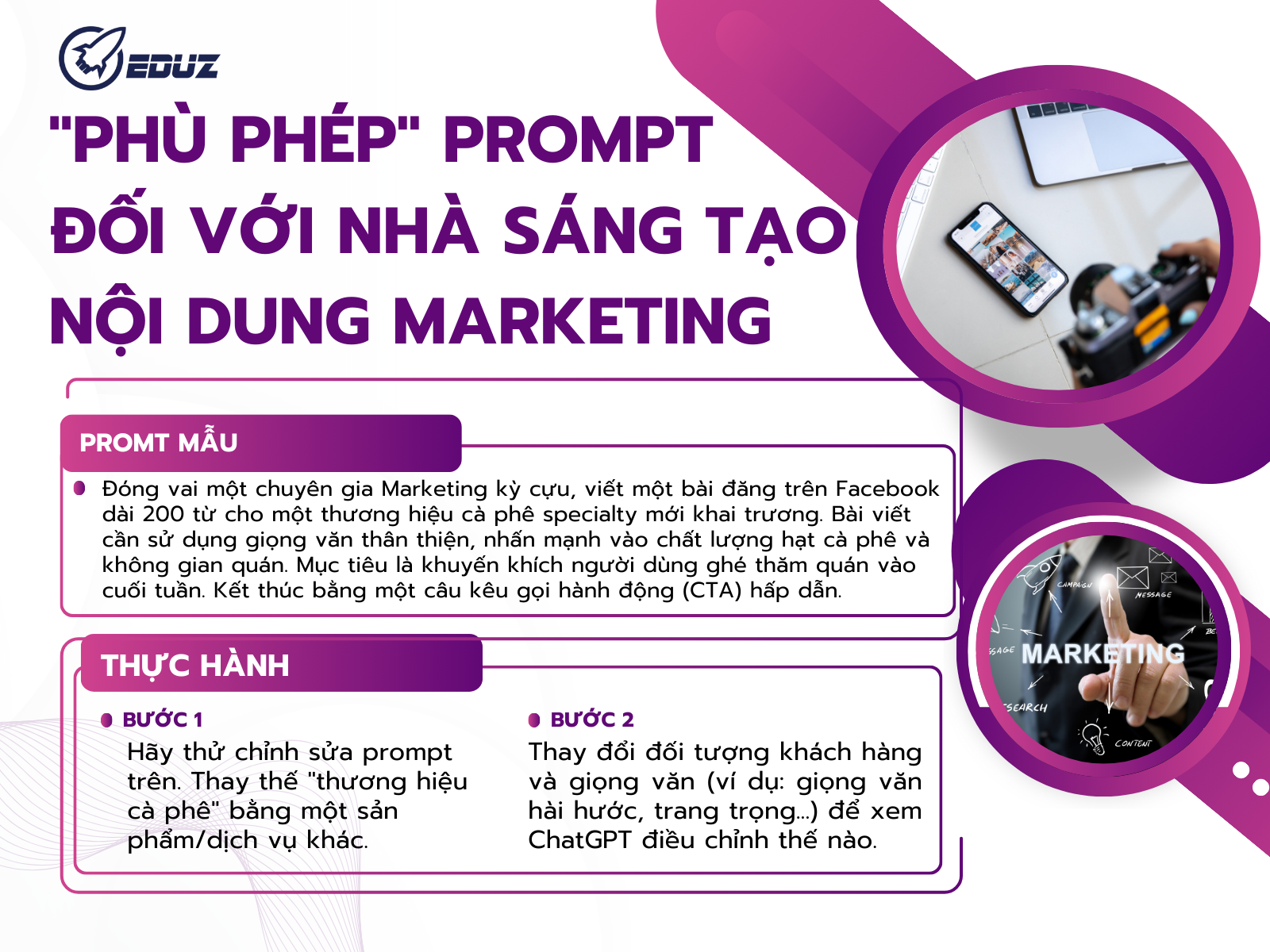 Prompt mẫu: "Đóng vai một chuyên gia Marketing kỳ cựu, viết một bài đăng trên Facebook dài 200 từ cho một thương hiệu cà phê specialty mới khai trương. Bài viết cần sử dụng giọng văn thân thiện, nhấn mạnh vào chất lượng hạt cà phê và không gian quán. Mục tiêu là khuyến khích người dùng ghé thăm quán vào cuối tuần. Kết thúc bằng một câu kêu gọi hành động (CTA) hấp dẫn."