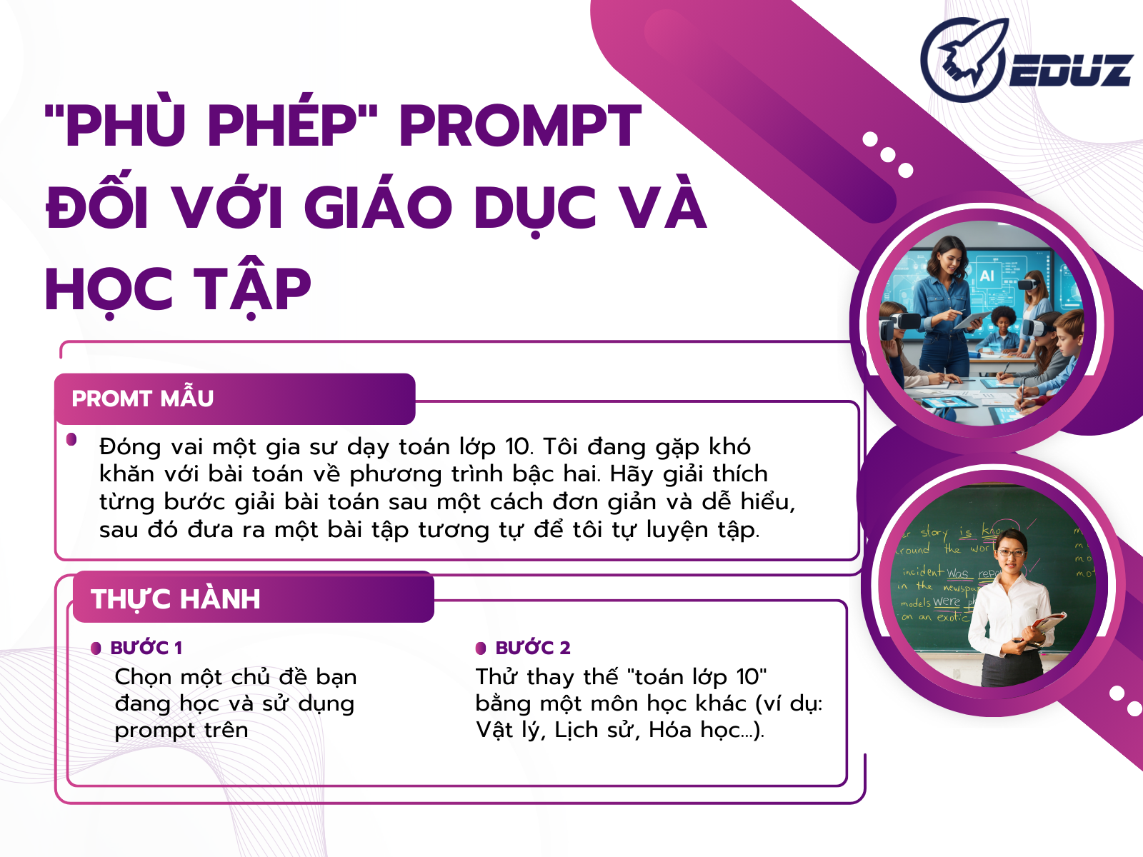 Prompt mẫu: "Đóng vai một gia sư dạy toán lớp 10. Tôi đang gặp khó khăn với bài toán về phương trình bậc hai. Hãy giải thích từng bước giải bài toán sau một cách đơn giản và dễ hiểu, sau đó đưa ra một bài tập tương tự để tôi tự luyện tập."