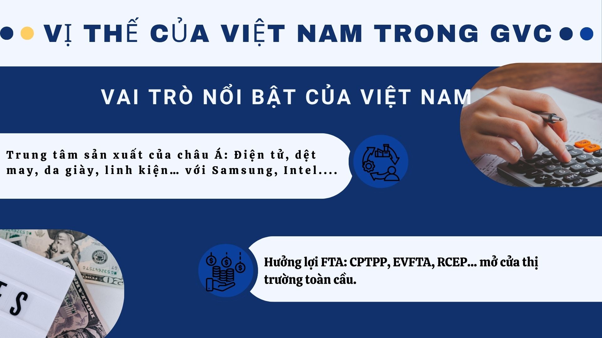 Việt Nam được đánh giá là một trong những điểm đến nổi bật tại châu Á cho các nhà đầu tư nước ngoài nhờ vào sự ổn định chính trị, nguồn lao động dồi dào, chi phí sản xuất hợp lý và chính sách mở cửa kinh tế linh hoạt. Vai trò của Việt Nam trong GVC hiện nay được thể hiện qua các khía cạnh sau: