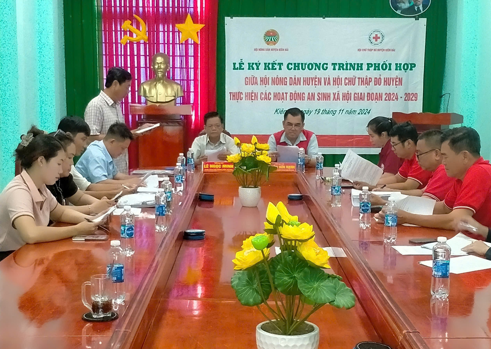 Chiều ngày 19/11, Hội Chữ thập đỏ huyện cùng với Hội Nông dân huyện Kiên Hải tổ chức ký kết Chương trình phối hợp về thực hiện an sinh xã hội, giai đoạn 2024-2029. Tham dự buổi lễ có Ông Lê Ngọc Minh, Huyện ủy viên, Chủ tịch Hội Nông dân huyện, Ông Nguyễn Hữu Hạnh, Chủ tịch Hội Chữ thập đỏ huyện cùng các đồng chí đại diện Ban Thường vụ, Ban Chấp hành Hội Chữ thập đỏ và Hội Nông dân huyện tham dự.