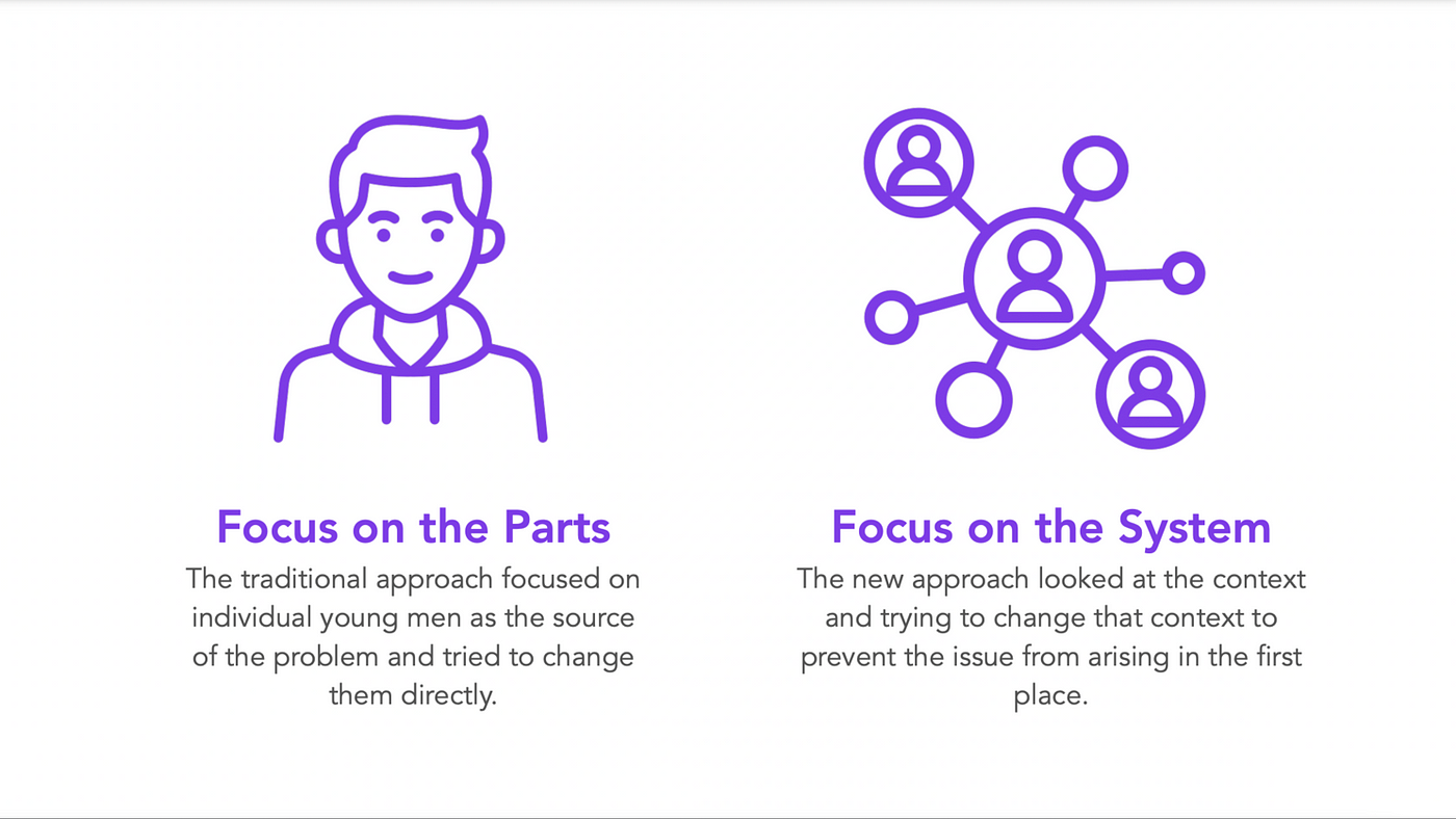 Cho đến đầu những năm 2000, Glasgow nổi tiếng là một trong những thành phố bạo lực nhất ở châu Âu. Thay vì chống tội phạm nhắm vào những kẻ phạm tội cá nhân và là một động thái điển hình mà không ai phản đối, cảnh sát trưởng mới, Karyn McCluskey, đã quyết định thay đổi tình hình bằng cách thay đổi quan điểm và câu chuyện sang phòng chống tội phạm. McCluskey có nền tảng là điều dưỡng, trước đây bà đã làm việc với các cộng đồng như y tế, các vấn đề xã hội, giáo dục, nhà thờ, để tạo ra sự thay đổi. Trong trường hợp này, McCluskey đóng vai trò là Người trong cuộc/Người ngoài cuộc bằng cách làm việc trong hệ thống; bà có thể thấy được điểm mạnh và điểm yếu của hệ thống; nhưng vẫn có uy tín để đưa ra những ý tưởng mới từ bên ngoài. Đơn vị Giảm bạo lực coi bạo lực là một cuộc khủng hoảng sức khỏe cộng đồng, đây là một sự thay đổi đáng kể về vấn đề, cho phép các khả năng và cuộc trò chuyện khác nhau diễn ra.