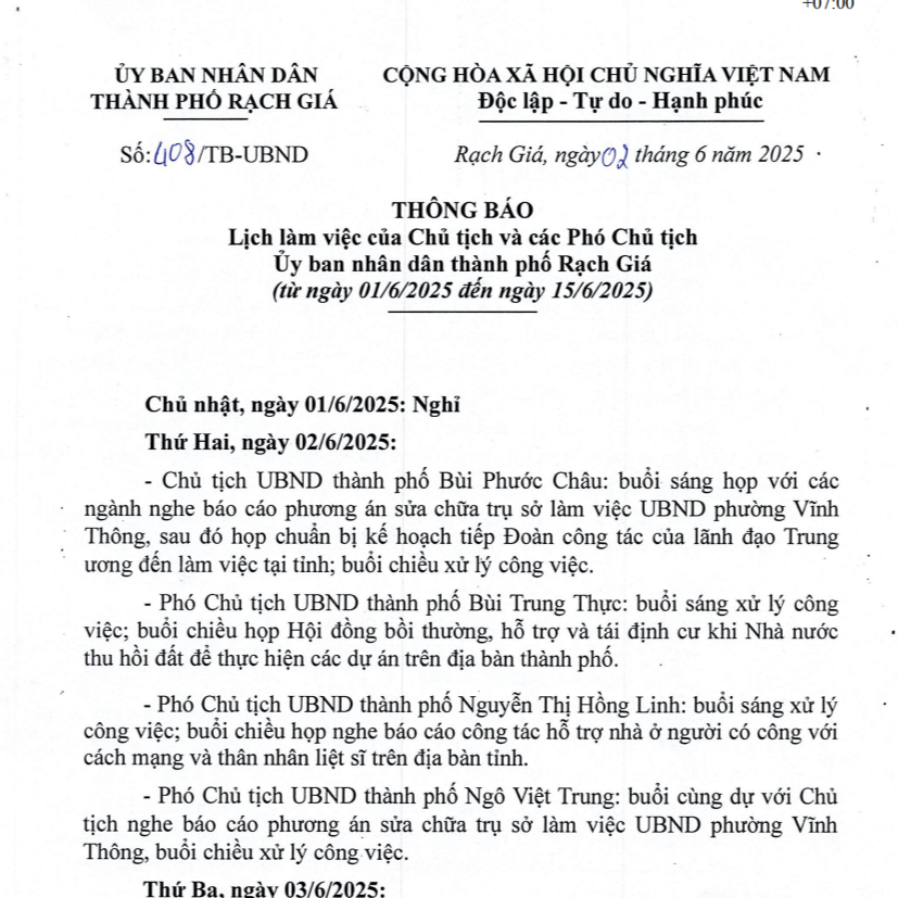 Thông báo Lịch làm việc của Chủ tịch và các Phó Chủ tịch Ủy ban nhân dân thành phố Rạch Giá (từ ngày 01/6/2025 đến ngày 15/5/2025)