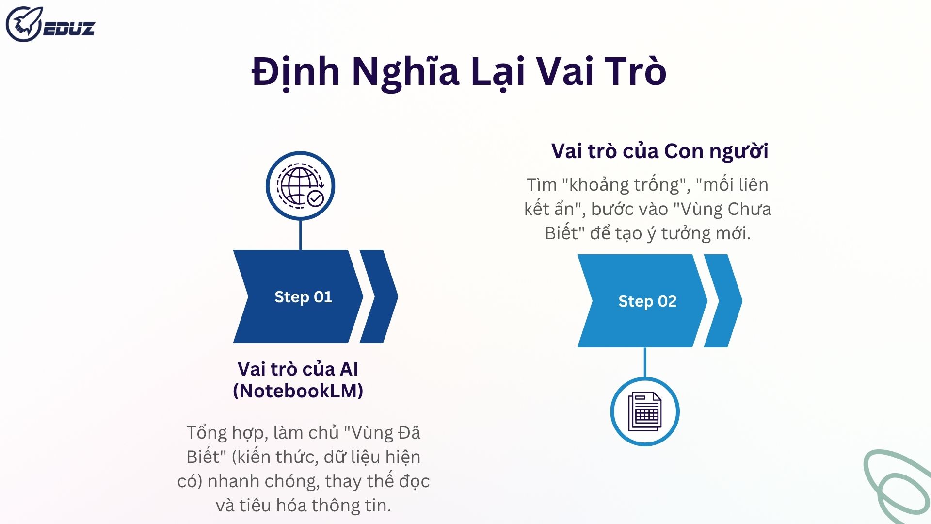 - Vai trò của AI (NotebookLM): Giúp chúng ta tổng hợp và làm chủ toàn bộ "Vùng Đã Biết" (Known Territory) - tức là tất cả các kiến thức, dữ liệu hiện có - một cách nhanh chóng và hiệu quả nhất. Nó làm thay chúng ta phần việc tốn thời gian nhất là đọc và tiêu hóa thông tin.