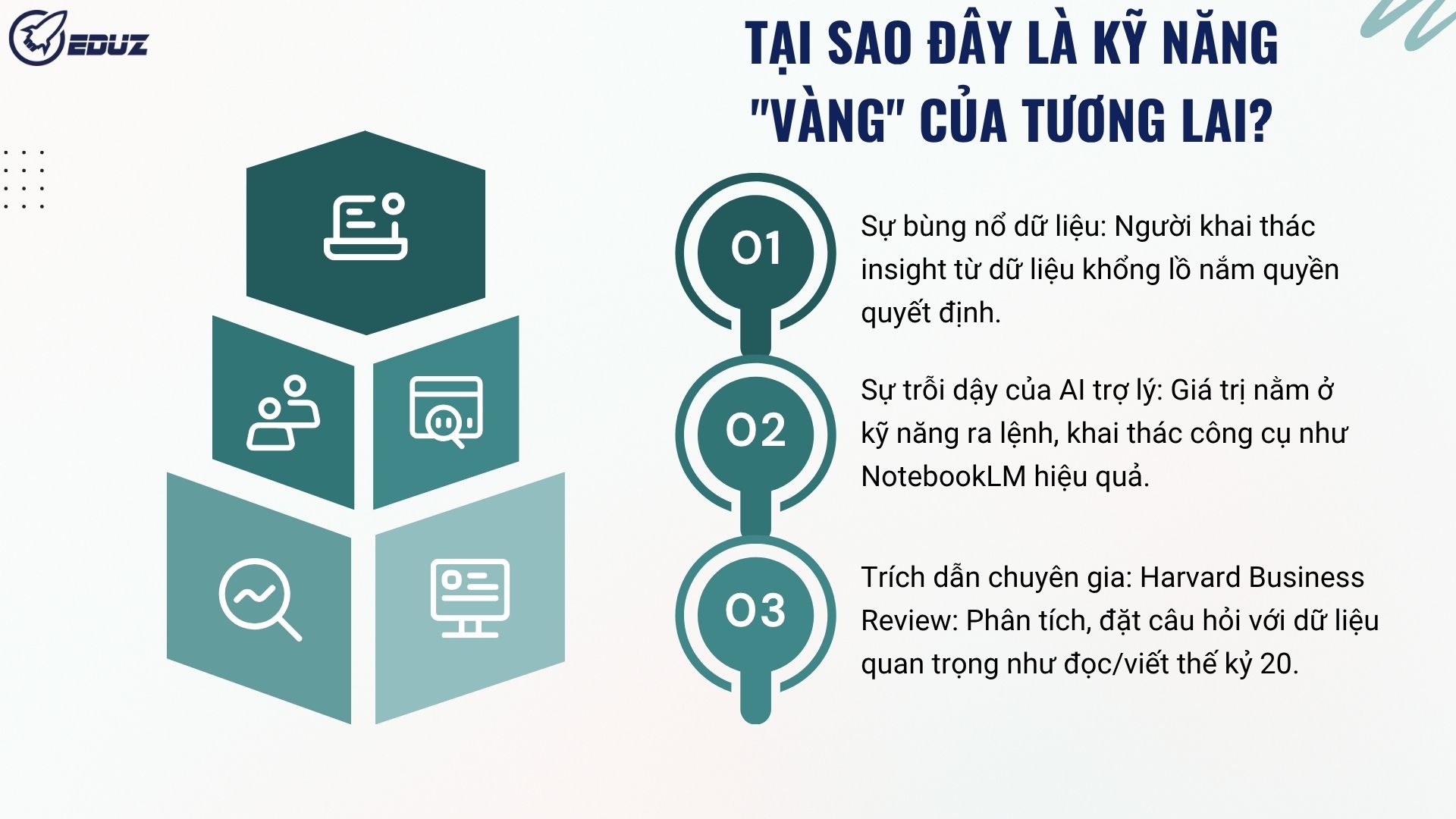 - Sự bùng nổ của Dữ liệu: Mọi cá nhân và doanh nghiệp đều đang tạo ra một lượng dữ liệu khổng lồ. Người có khả năng "nói chuyện" với dữ liệu đó để tìm ra insight sẽ là người nắm giữ quyền lực ra quyết định.