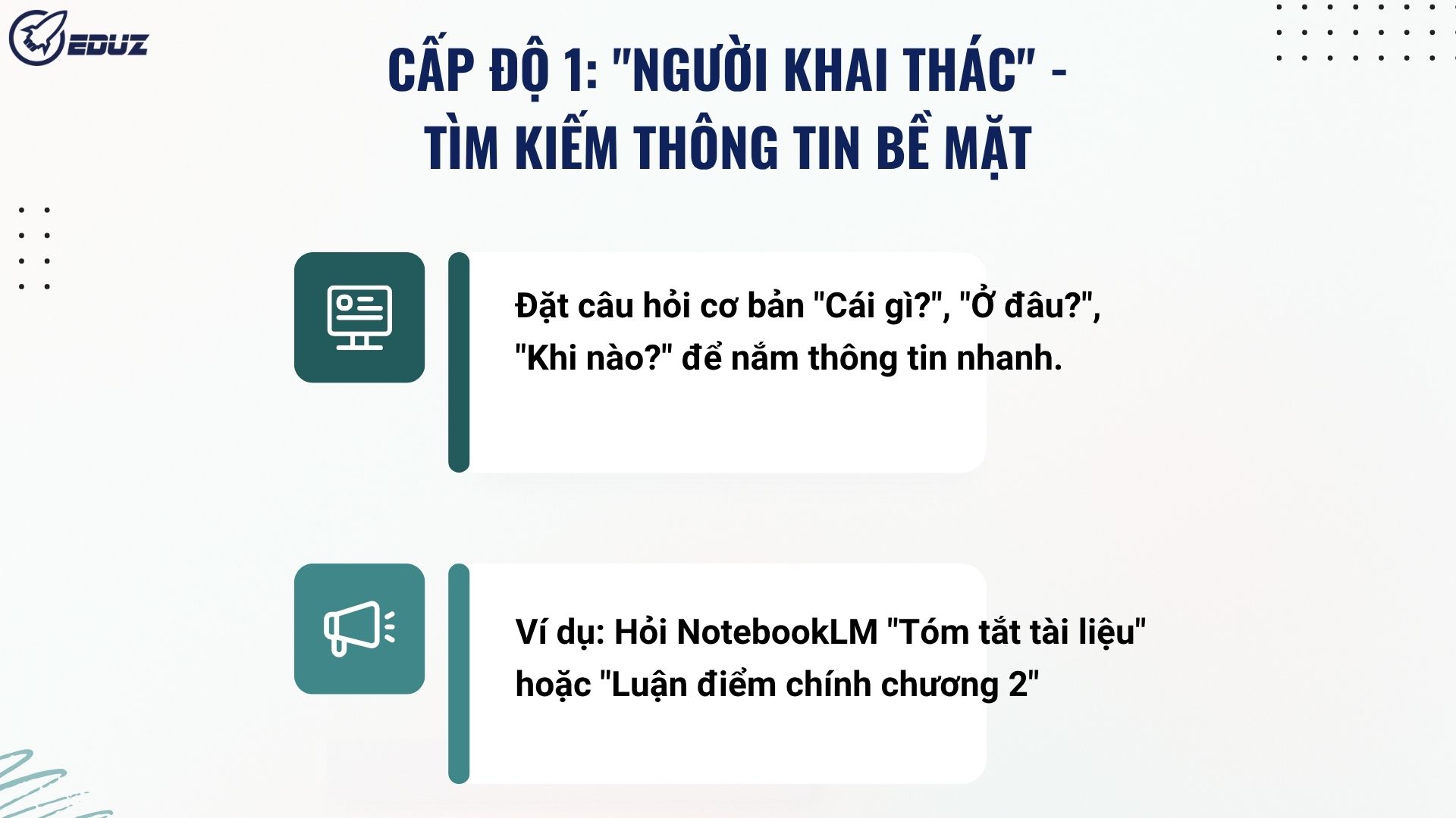 Đây là cấp độ cơ bản nhất, nơi bạn đặt những câu hỏi "Cái gì?", "Ở đâu?", "Khi nào?" để nhanh chóng nắm bắt thông tin.