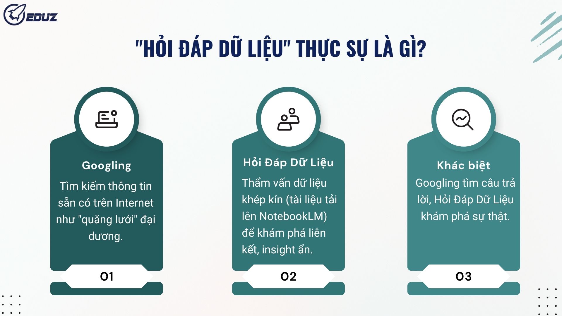 Nói một cách đơn giản, Googling là tìm kiếm câu trả lời, còn Hỏi Đáp Dữ Liệu là khám phá ra sự thật.