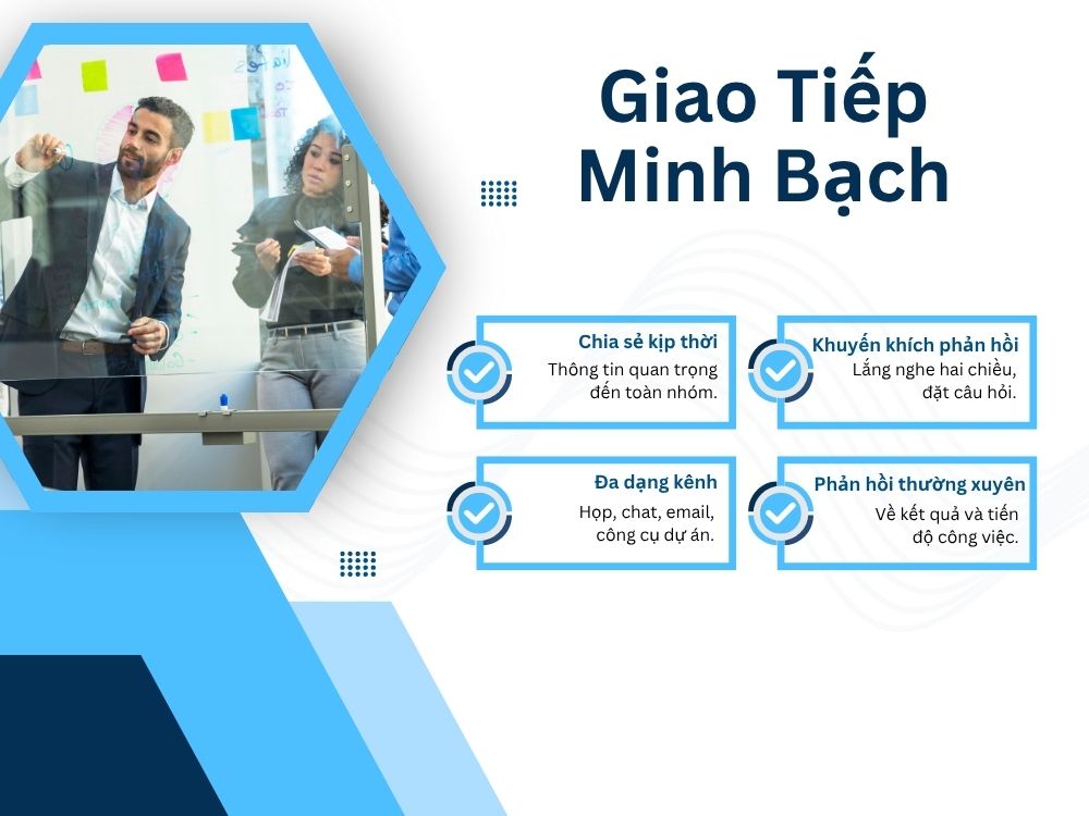 Sử dụng đa dạng kênh giao tiếp (họp trực tiếp, chat nhóm, email, công cụ quản lý dự án) để đảm bảo thông tin đến được mọi thành viên một cách hiệu quả nhất.