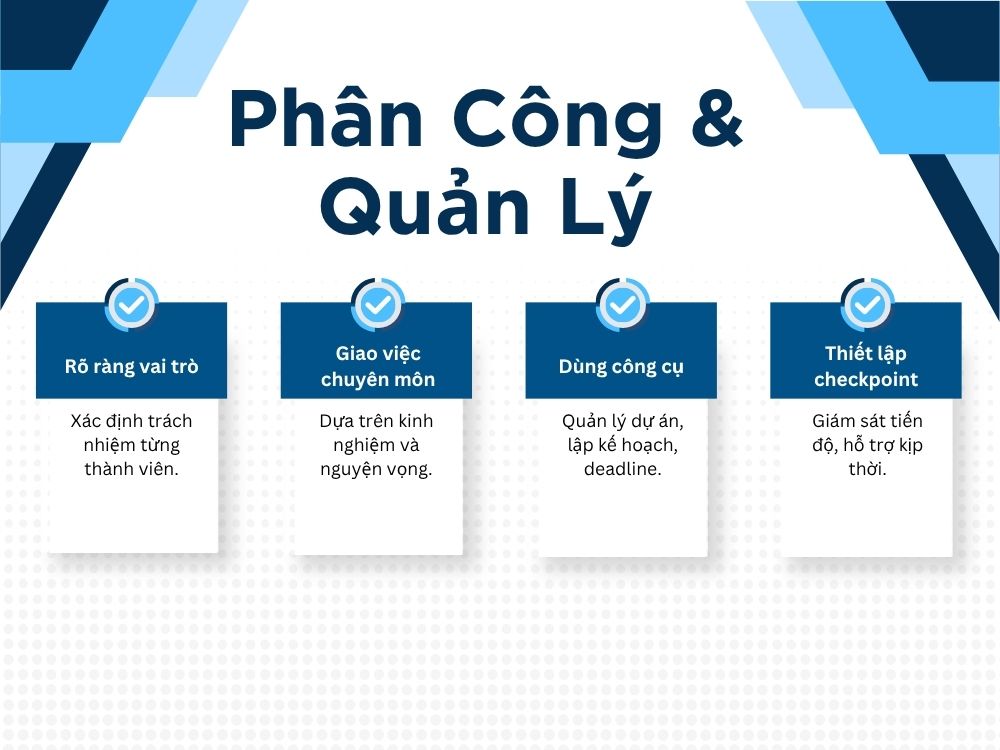 Sử dụng công cụ quản lý dự án (Trello, Asana, Jira…) để lập kế hoạch, gắn deadline, giao tài nguyên và theo dõi tiến độ một cách minh bạch.