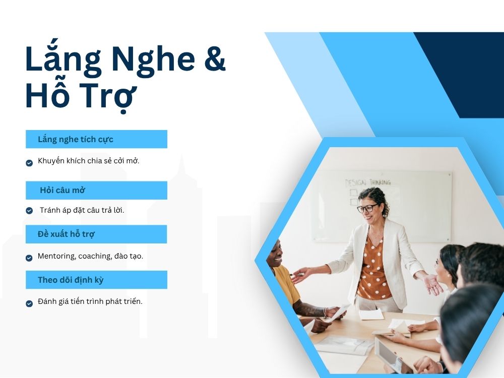 Đưa ra các nguồn hỗ trợ cụ thể như mentoring, coaching, khóa đào tạo nội bộ hoặc bên ngoài để nhân viên cải thiện kỹ năng, giải quyết vướng mắc.