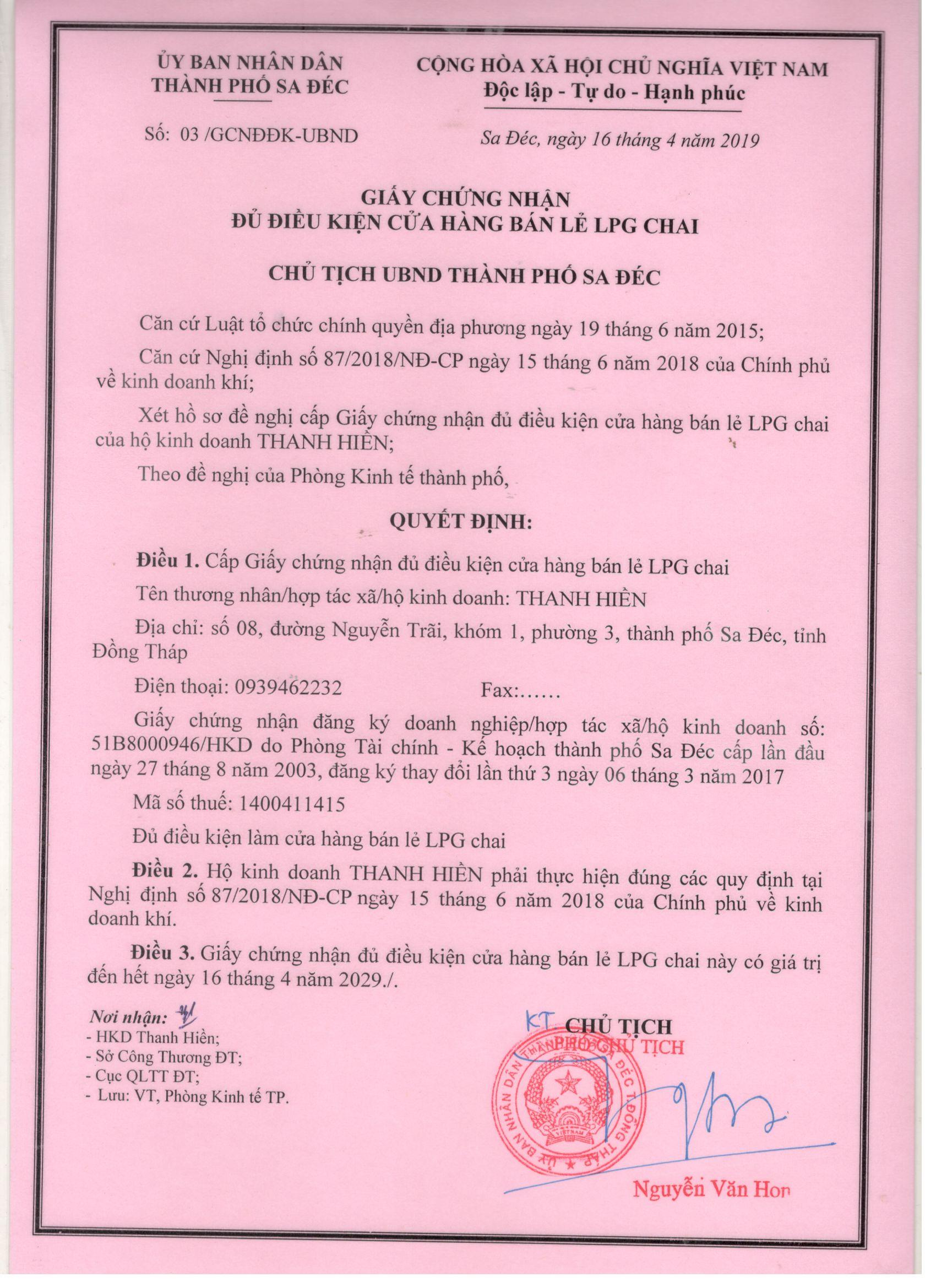 Chúng tôi tự hào là đơn vị được Sở Công Thương tỉnh Đồng Tháp cấp giấy chứng nhận đủ điều kiện kinh doanh mua bán gas (LPG) theo quyết định số 101/GCNĐĐK-SCT ngày 29/09/2021.