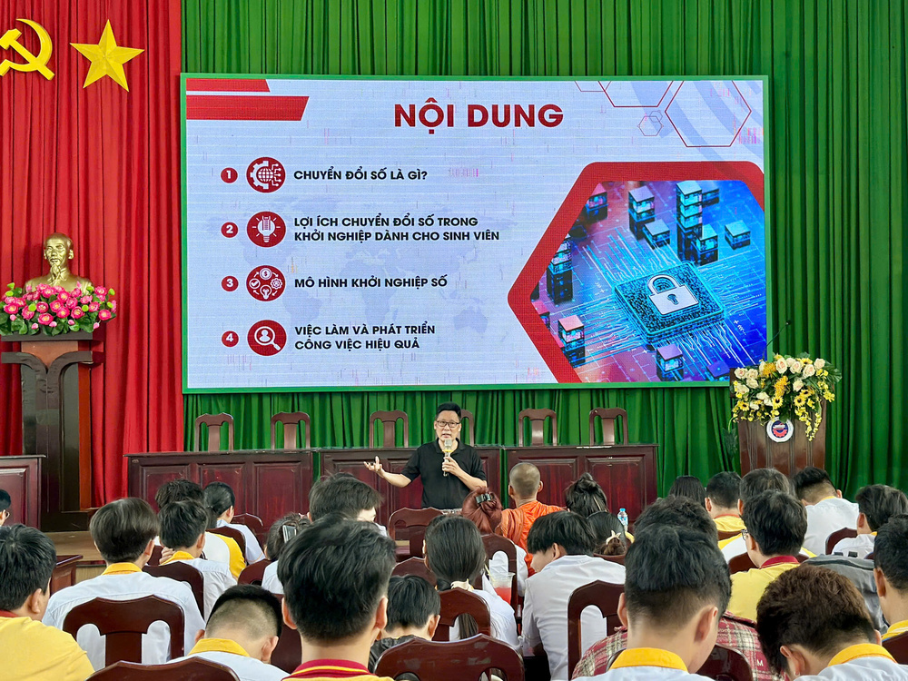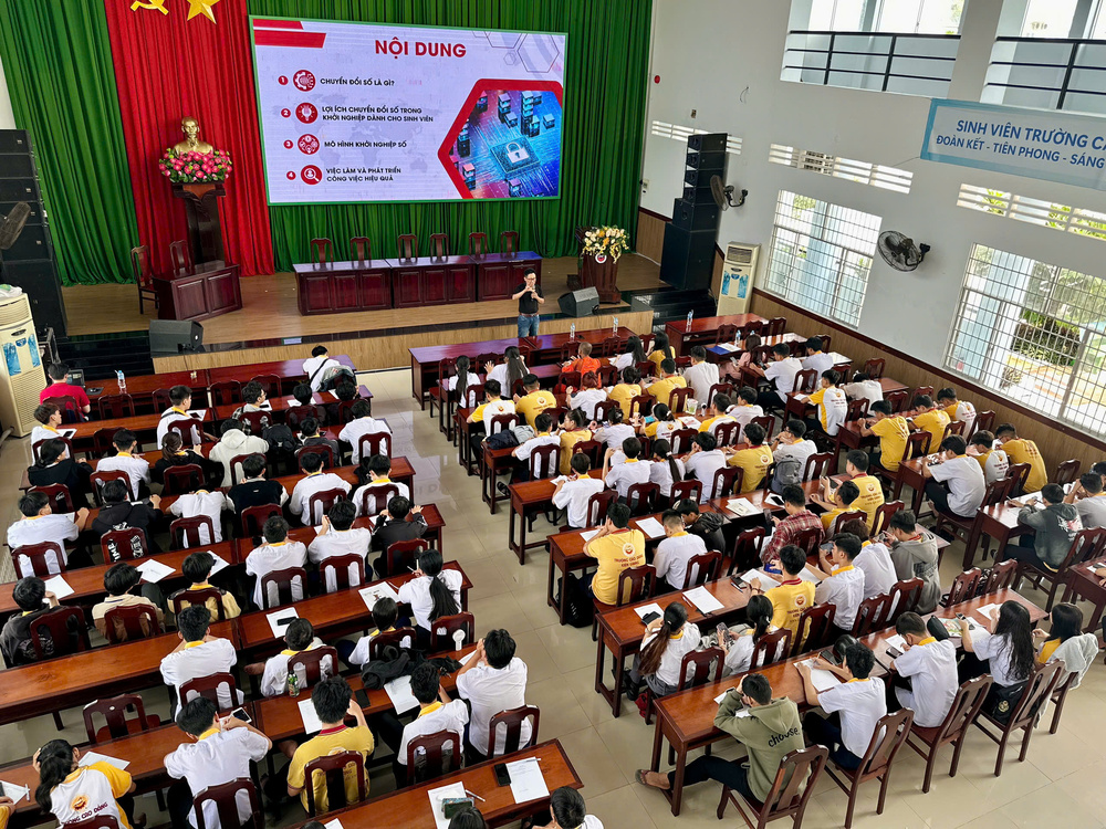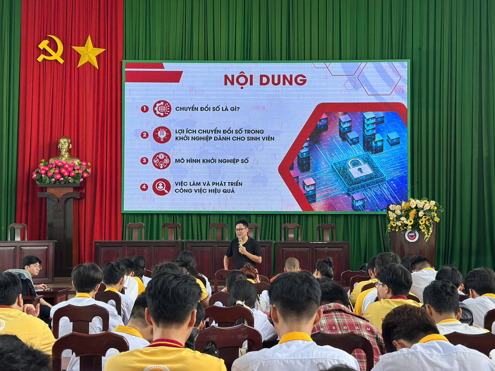 Cũng trong buổi chia sẻ, diễn giả nhấn mạnh rằng để ứng dụng hiệu quả chuyển đổi số, sinh viên cần xác định rõ mục tiêu nghề nghiệp ngay từ khi còn ngồi trên ghế nhà trường. Theo ông, sinh viên hiện nay thường lựa chọn một trong hai hướng đi: tìm kiếm việc làm để vận dụng kiến thức và kỹ năng vào môi trường doanh nghiệp, hoặc khởi nghiệp dựa trên năng lực cá nhân và tận dụng nền tảng số để phát triển mô hình kinh doanh.