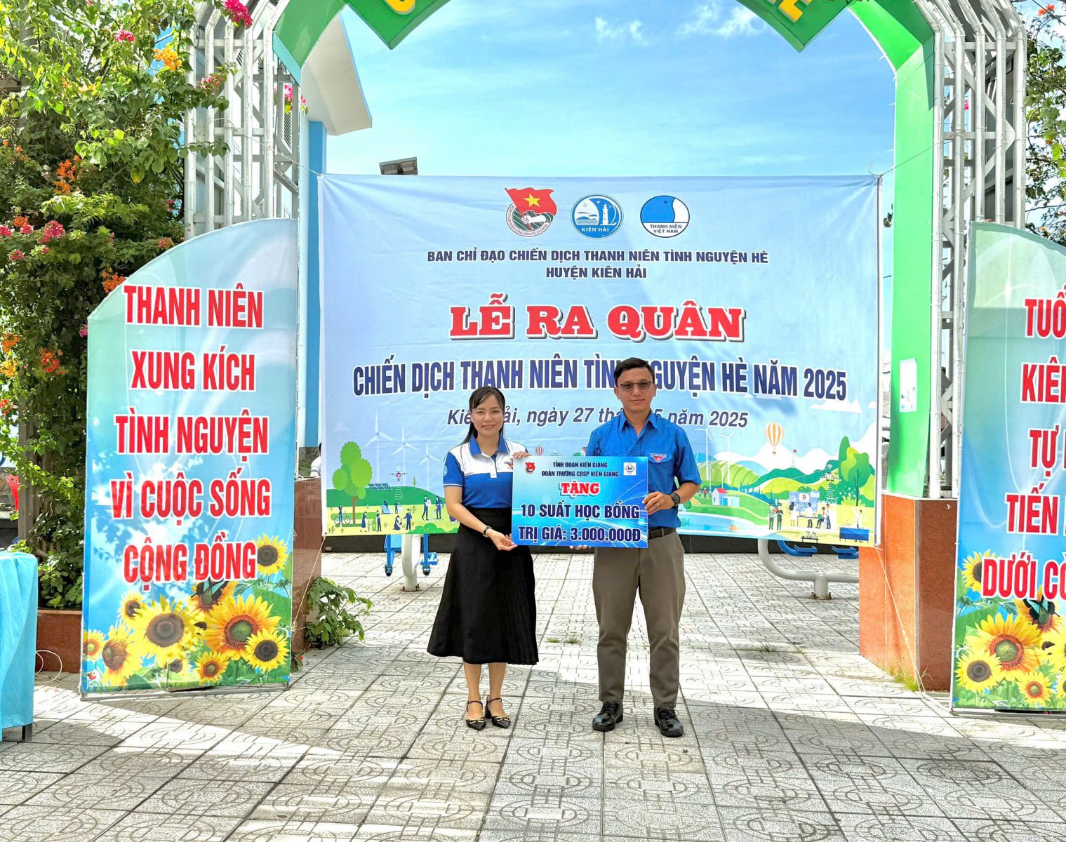 Trong Lễ ra quân, Ban Thường vụ Huyện đoàn đã vận động các mạnh thường quân 01 công trình tuyến đường cờ chào mừng Đại hội cháu ngoan Bác Hồ và Đại hội Đảng các cấp trị giá 15.000.000 đồng và vận động trao tặng 50 lá cờ Tổ quốc cho xã đoàn Hòn Tre. Ngoài ra, Ban Thường vụ Huyện đoàn có phối hợp vận động Đoàn trường Cao đẳng Sư phạm Kiên Giang trao tặng 10 suất học bổng cho 10 em học sinh lớp 12 có hoàn cảnh khó khăn tại xã An Sơn và Nam Du mỗi suất trị giá 300.000 đồng. Bên cạnh đó, Huyện đoàn có trích Quỹ thực hành tiết kiệm của tuổi trẻ huyện nhà hỗ trợ 02 học sinh có hoàn cảnh khó khăn của trường THCS và THPT Kiên Hải mỗi suất trị giá 300.000 đồng.