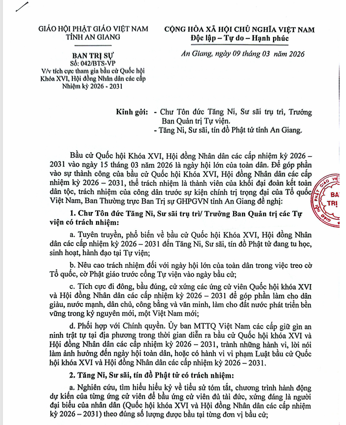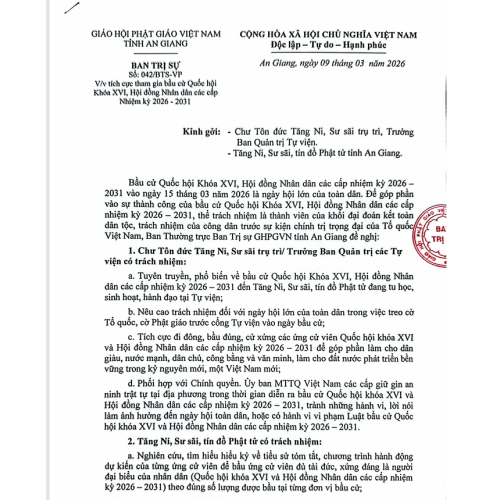 Chư tôn đức Tăng Ni và tín đồ Phật tử tỉnh An Giang. Tích cực hưởng ứng tham gia bầu cử Quốc hội khóa XVI, Hội đồng Nhân dân các cấp Nhiệm kỳ 2026 - 2031.