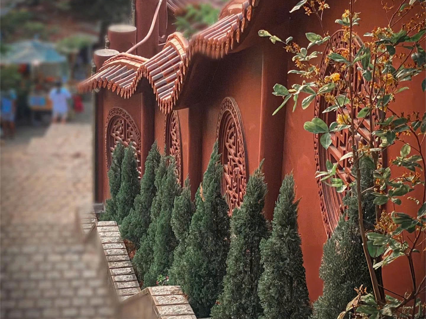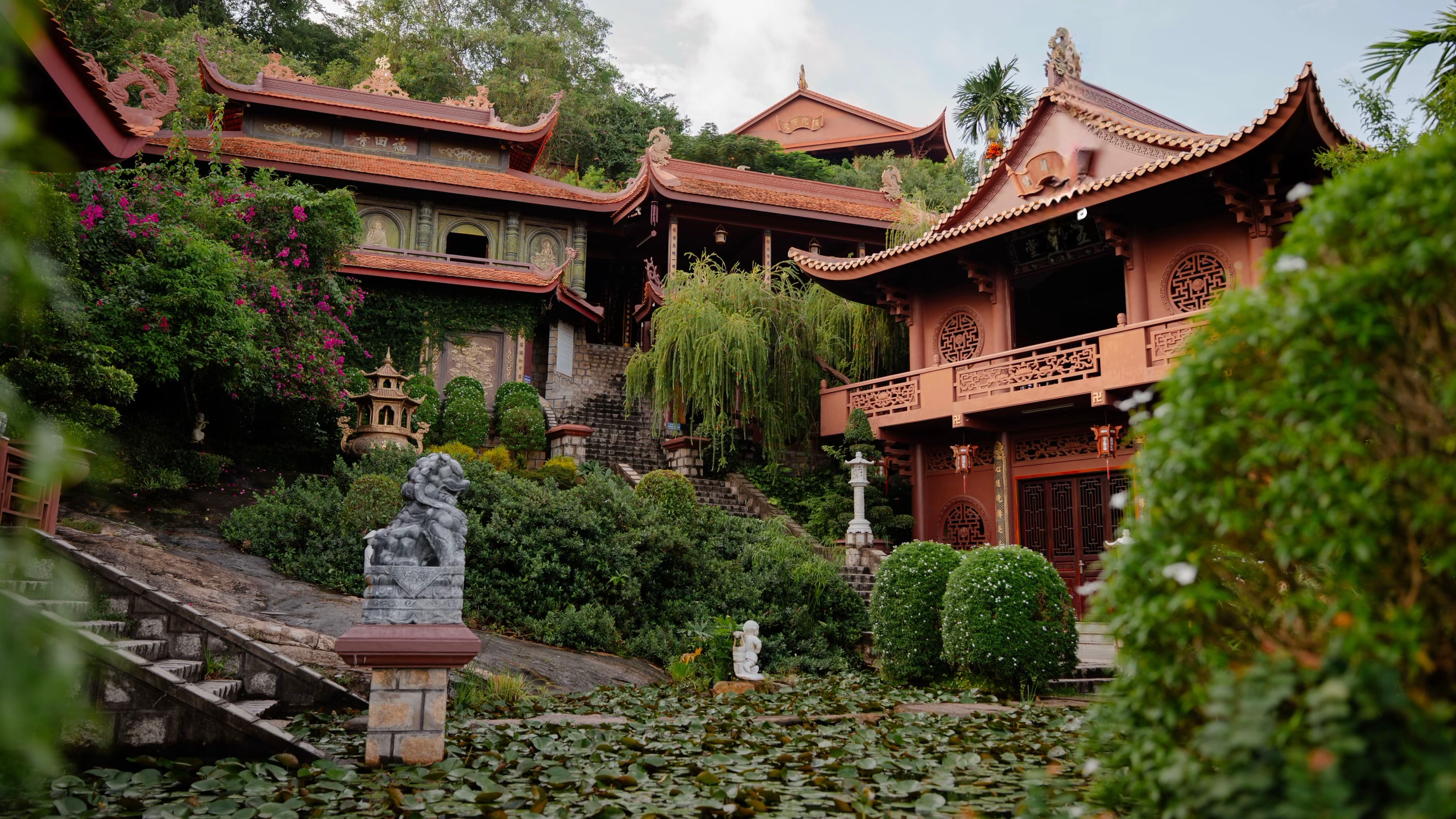 Không gian chùa được bao quanh bởi cây rừng xanh mát, tiếng chim và gió núi làm nổi bật vẻ cổ kính của các công trình. Những lối đá rêu phong, lan can uốn lượn, các chòi nghỉ nhỏ mang lối kiến trúc dân gian Nam Bộ tạo nên cảm giác như đang bước vào cõi tĩnh lặng, thoát tục.