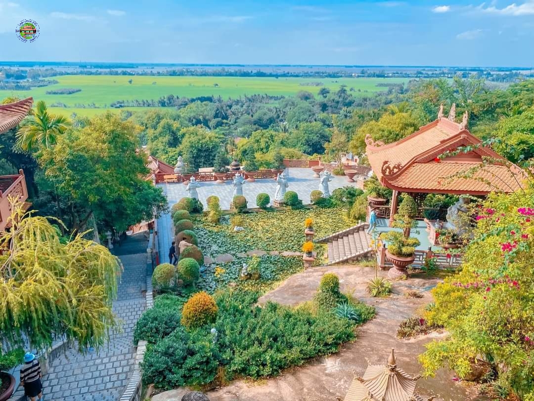 Từ chân Núi Sam, chúng ta men theo những bậc đá quanh co uốn lượn giữa rừng cây xanh thẳm. Con đường nhỏ dẫn lên chùa lúc ẩn, lúc hiện trong màn sương mỏng, tạo cảm giác như đang bước vào cõi tịnh độ. Càng lên cao, tầm nhìn càng mở rộng: phía xa là những cánh đồng Châu Đốc mênh mang, dòng sông Hậu uốn mình mềm mại, xen lẫn những cụm làng mạc yên bình.
