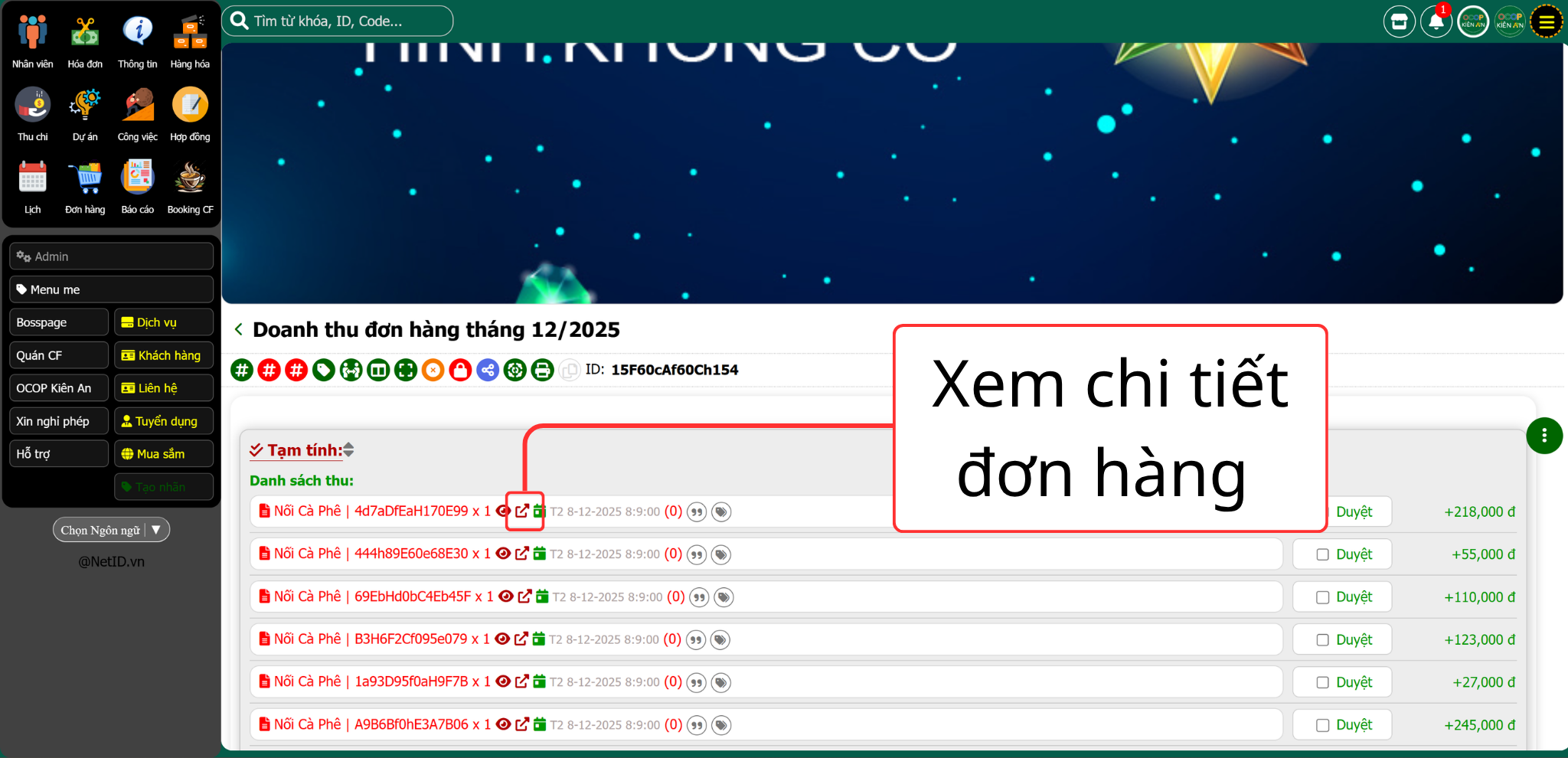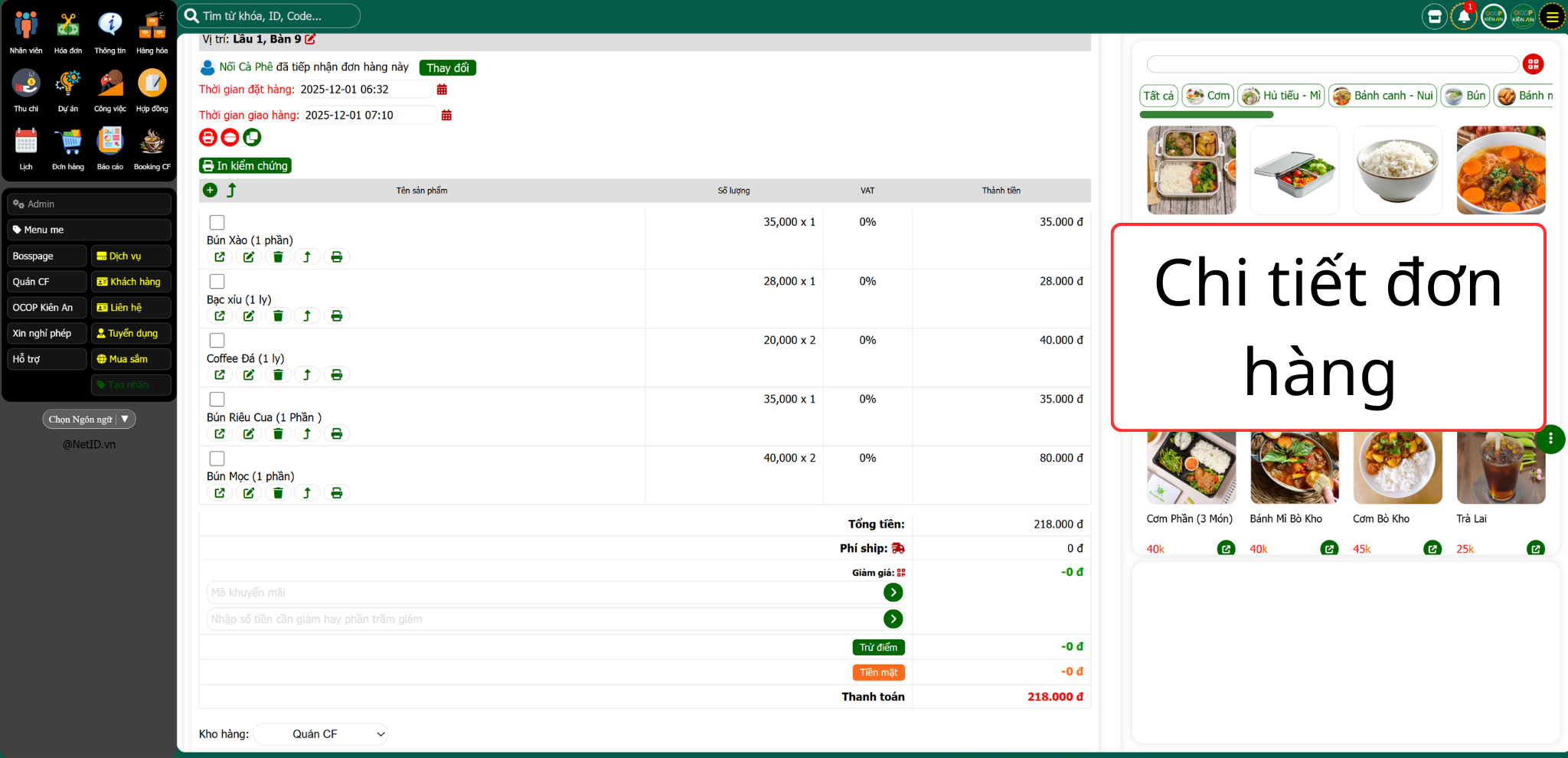 - icon mũi tên: Xem chi tiết các món đã được order trong 1 đơn hàng, in kiểm chứng, xác nhận đơn,.