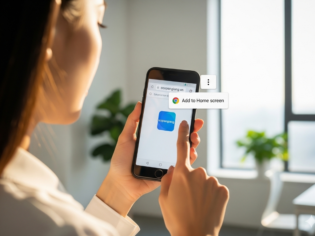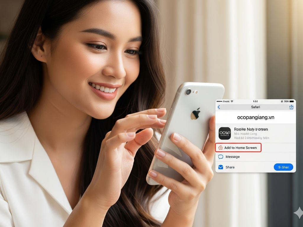Đặt tên nếu muốn → Nhấn “Thêm” để hoàn tất; biểu tượng ocopangiang.vn sẽ xuất hiện như một ứng dụng ngay trên màn hình điện thoại của bạn.