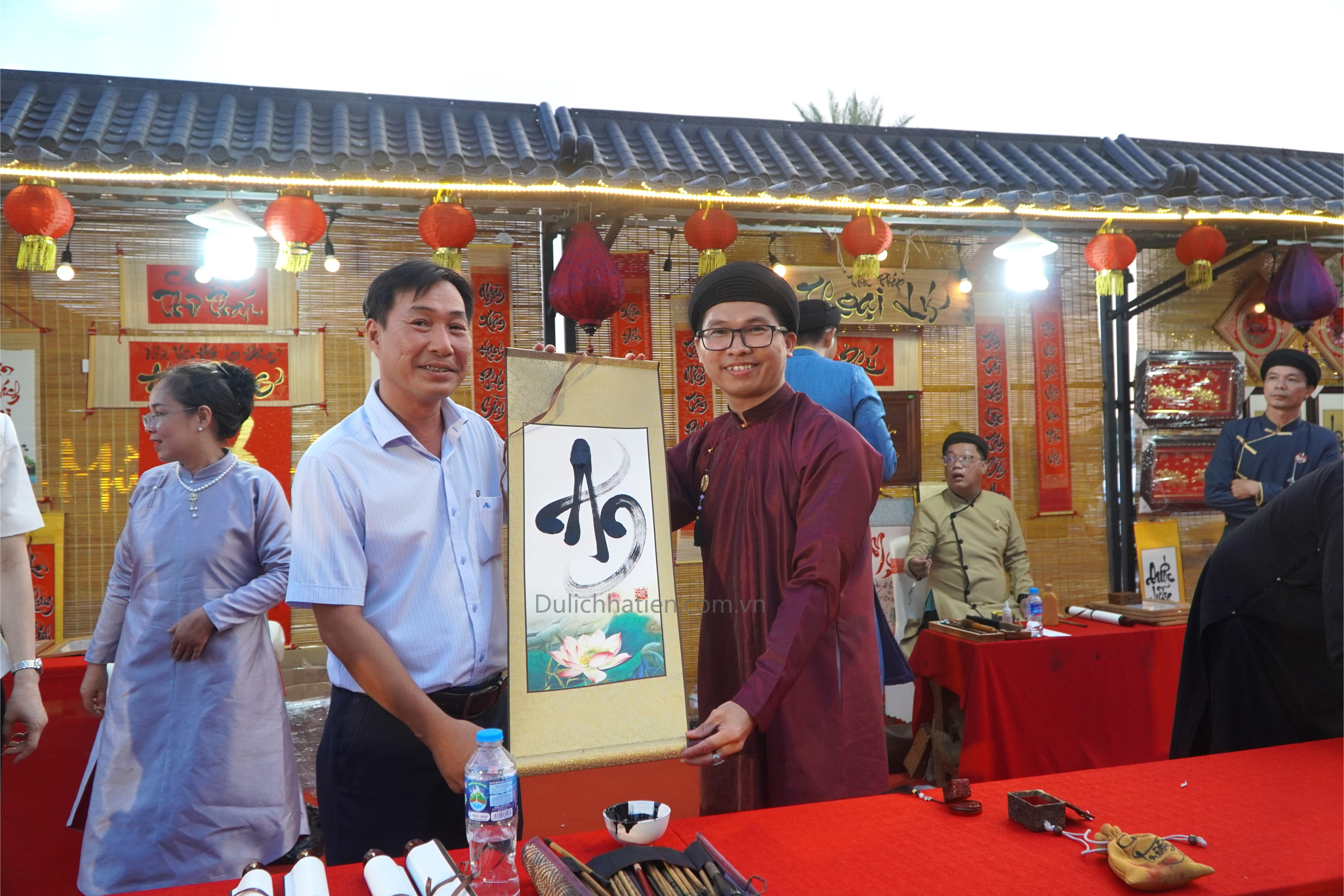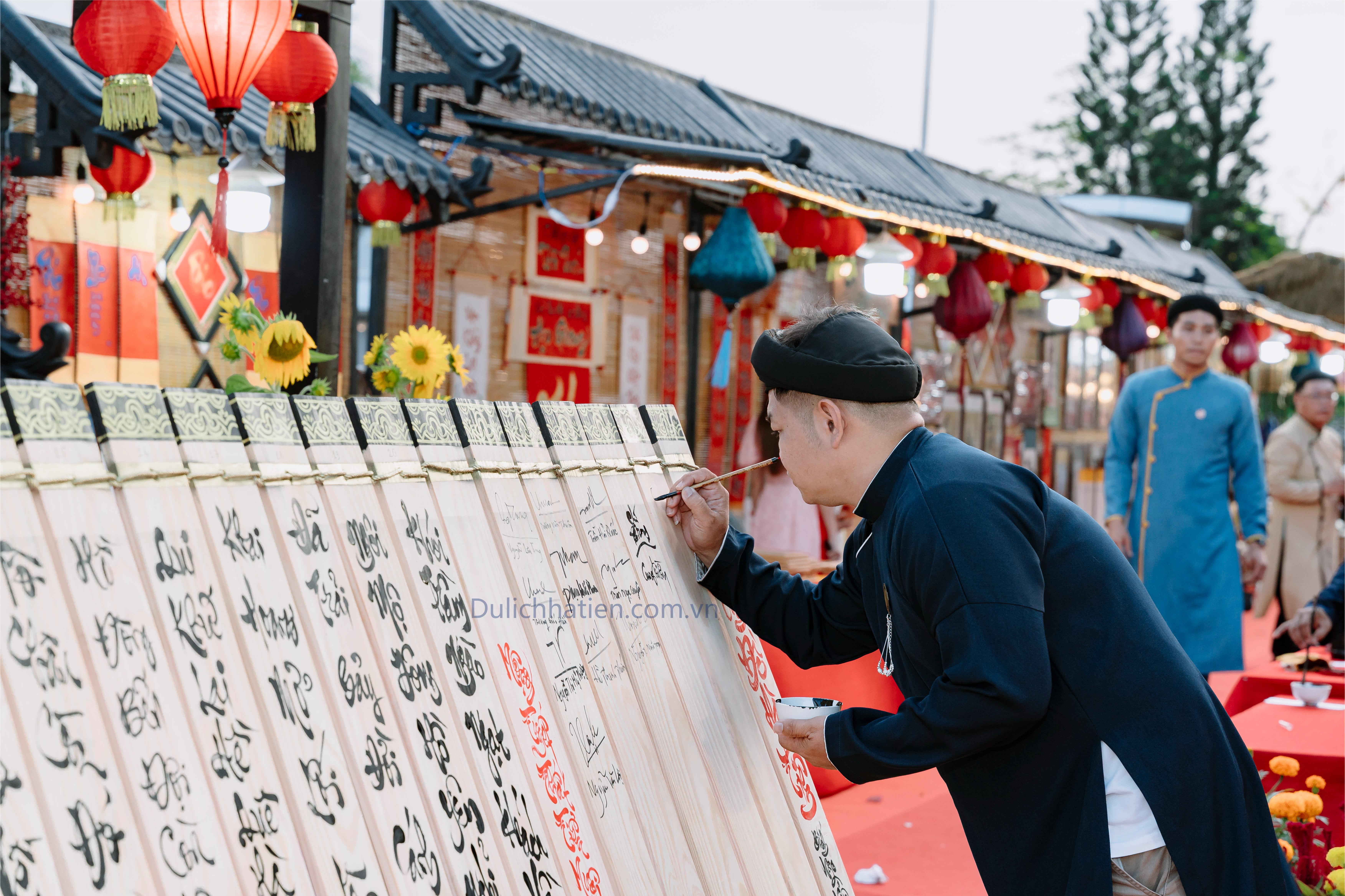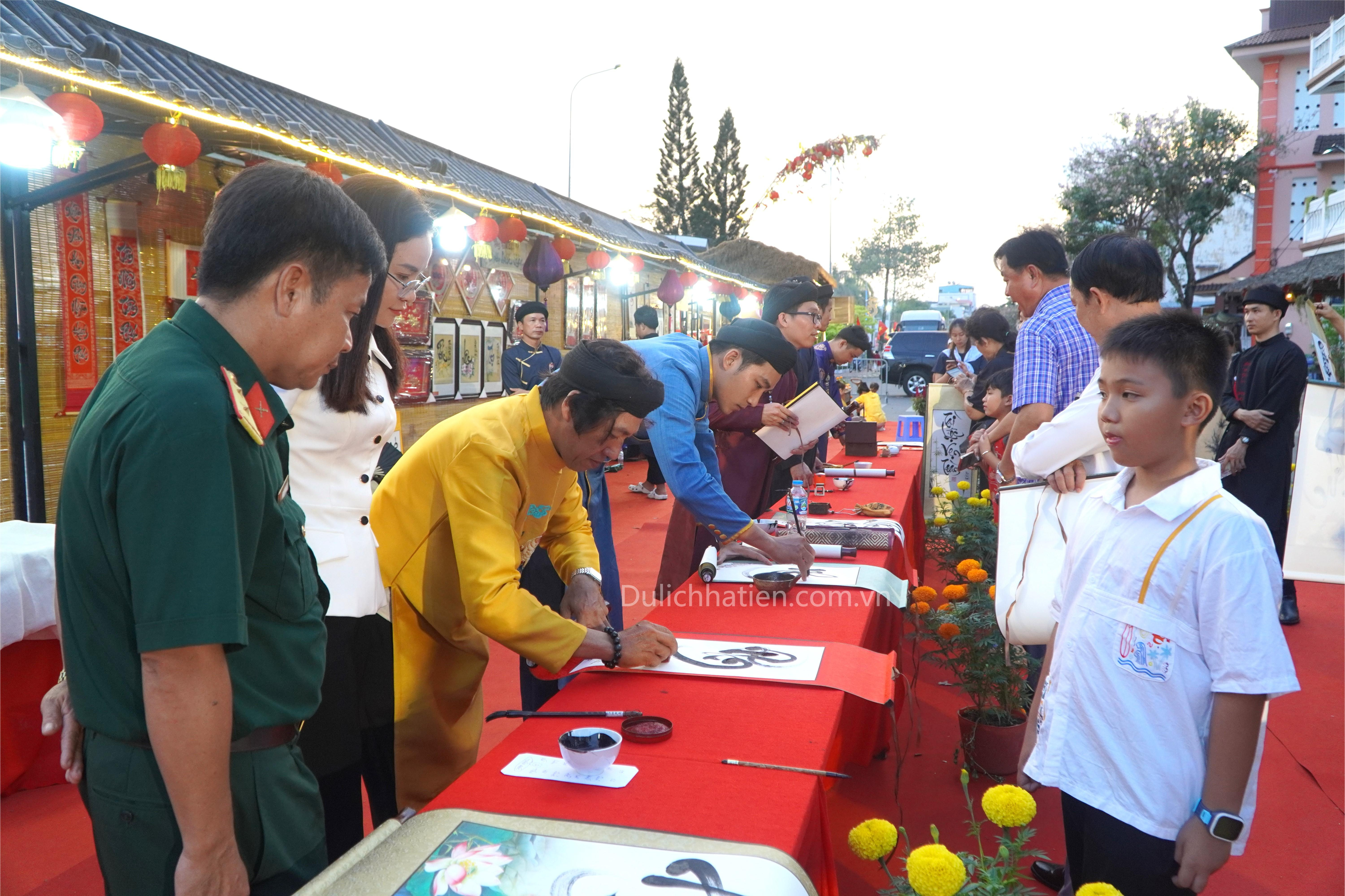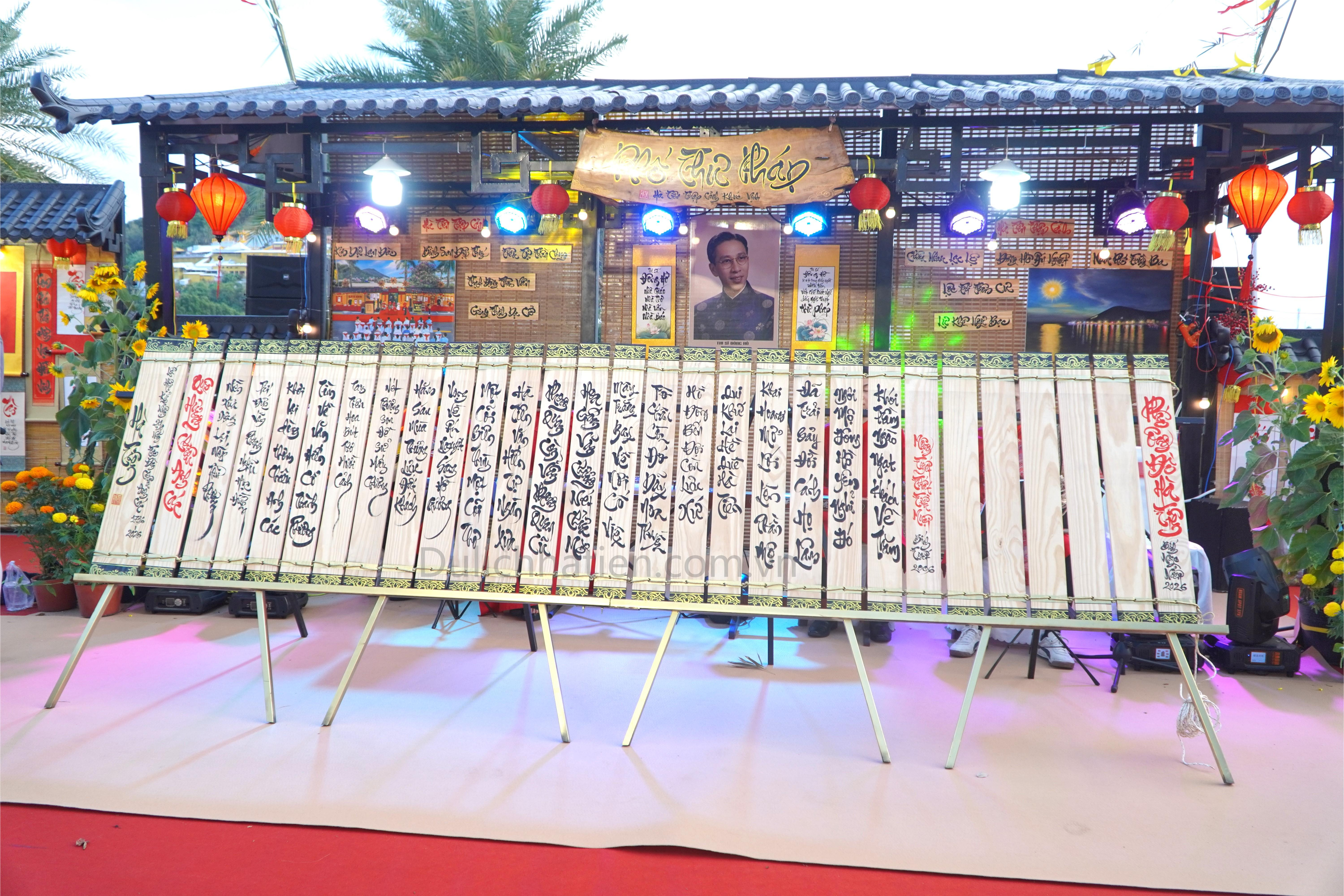 Không gian Phố thư pháp còn trưng bày nhiều câu đối, thơ xuân, chữ chúc; tác hiện hình ảnh ông đồ áo dài, khăn đóng; kết hợp biễu diễn nghệ thuật dân gian… tạo nên không gian văn hóa đặc sắc trong dịp lễ hội. Ngay trong ngày khai bút, đông đảo người dân và du khách đã đến tham quan, xin chữ và chụp ảnh lưu niệm.