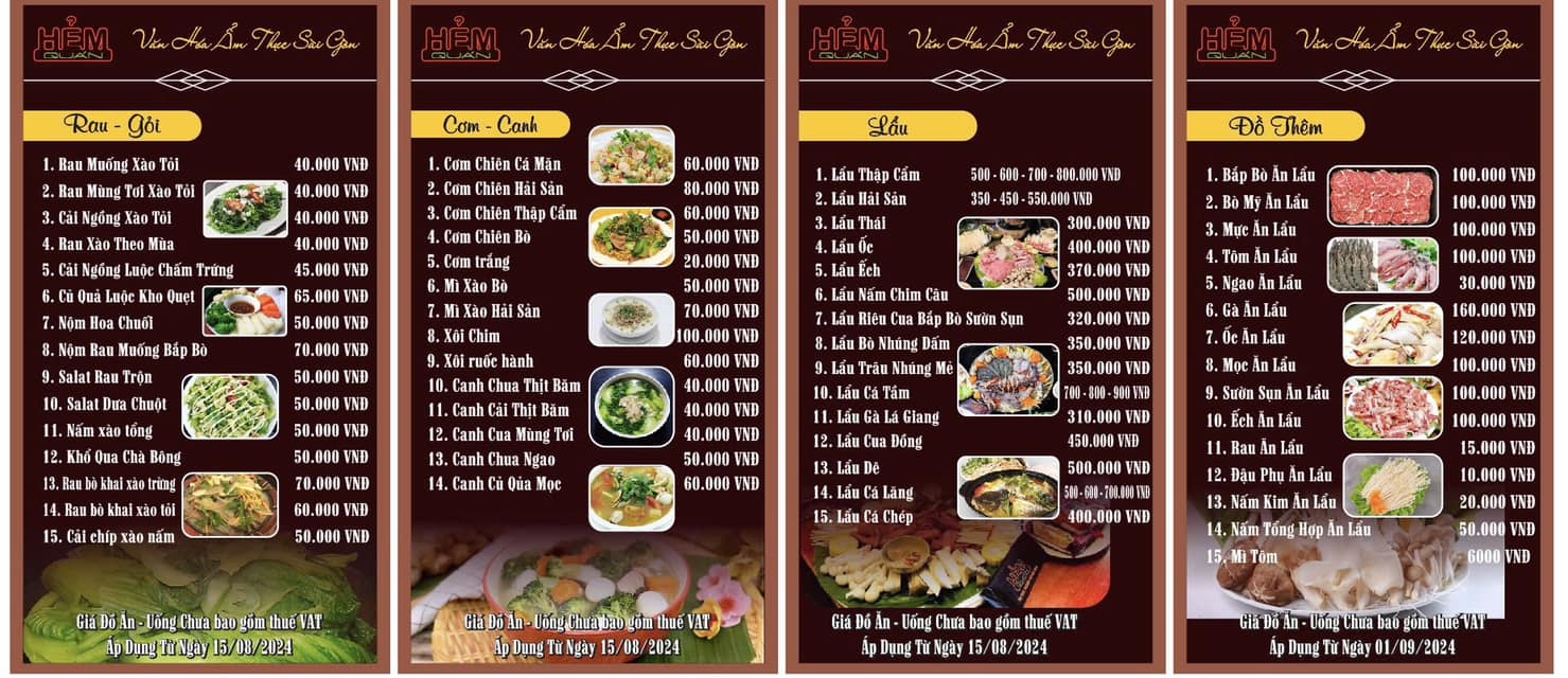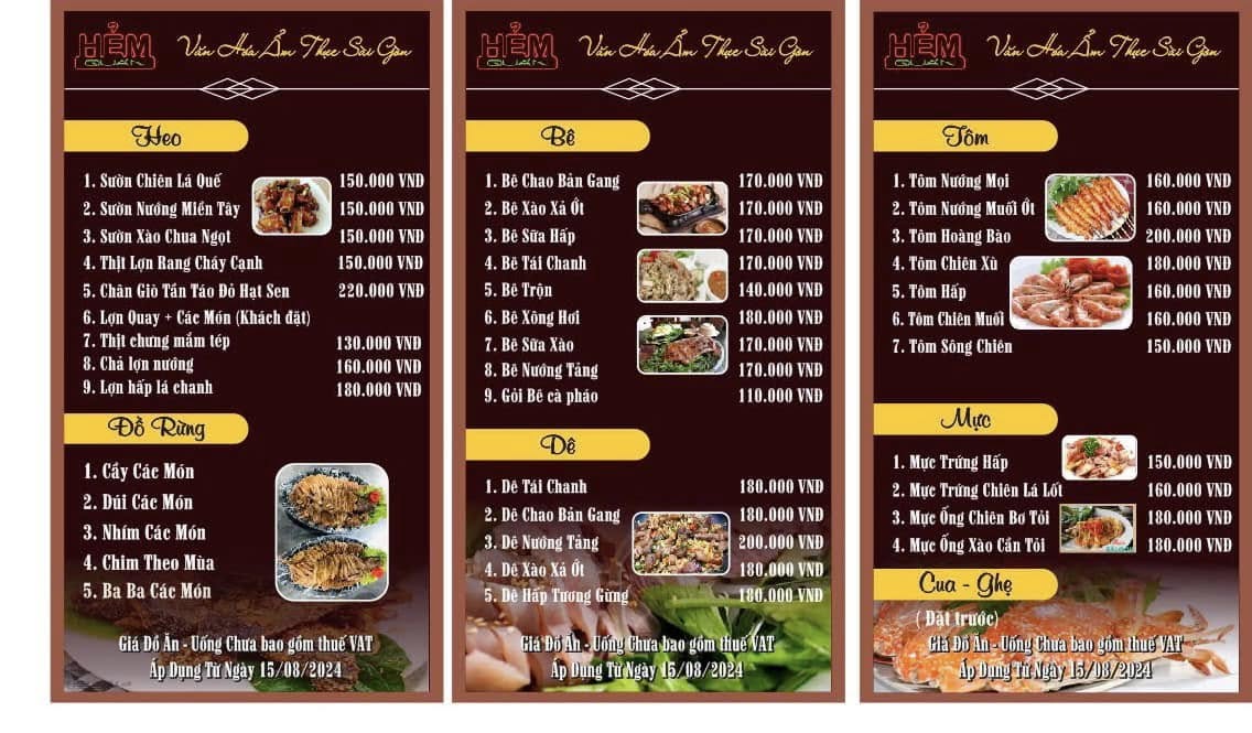 Nhà hàng mang phong cách hiện đại kết hợp nét ấm cúng, phù hợp cho cả dùng bữa thường ngày và tổ chức tiệc. Thực đơn đa dạng với hơn 150 món ăn hấp dẫn, được chế biến từ nguyên liệu tươi ngon, giữ trọn hương vị tinh tế. Đặc biệt, Hẻm Quán còn cung cấp dịch vụ tổ chức tiệc, liên hoan chuyên nghiệp và chu đáo, đáp ứng mọi nhu cầu của khách hàng.