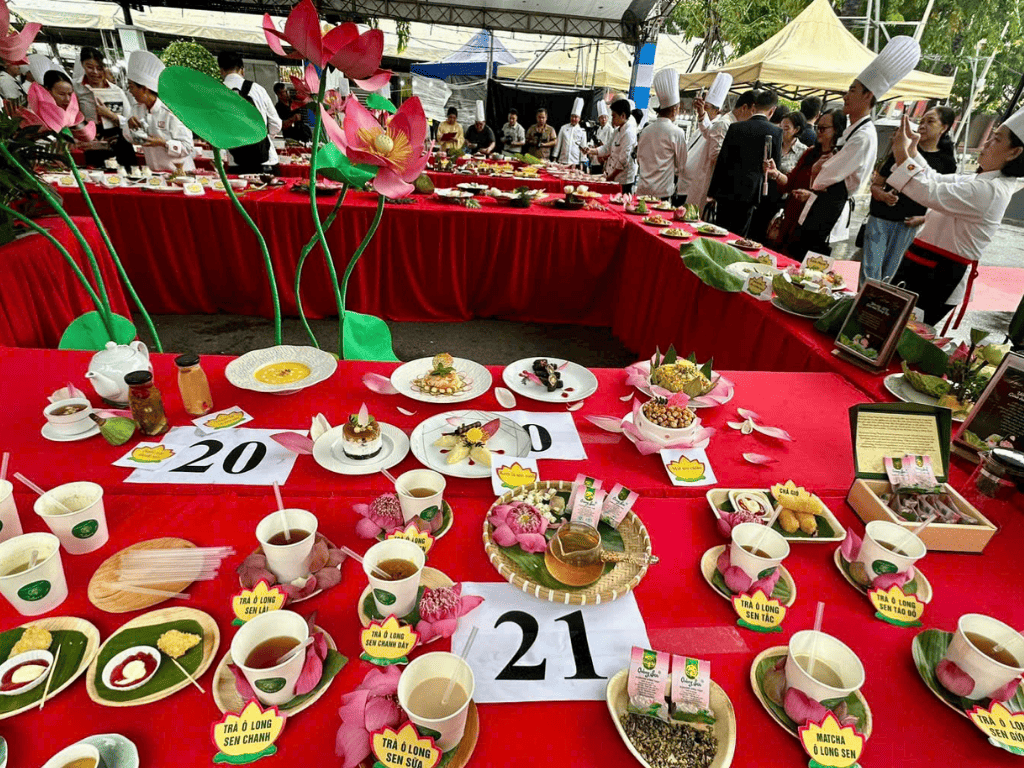 Hai đội đại diện cho Đất Sen Hồng – Du lịch Vườn Dừa Út Khuê và OolongSen (Ecohome) – đã mang đến những món ăn và thức uống sáng tạo, tôn vinh giá trị ẩm thực từ sen, góp phần lan tỏa tinh thần thuần chay và bản sắc văn hóa Đồng Tháp trong không gian lễ hội.