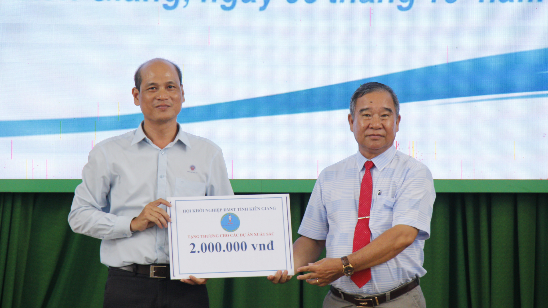 Tiến sĩ Nguyễn Xuân Niệm - Phó giám đốc Sở Khoa học công nghệ - Chủ tịch Hội khởi nghiệp ĐMST Kiên Giang tặng Bằng khen Chủ tịch UBND tỉnh Kiên Giang vì thành tích đạt giải cao trong Hội thi Khởi nghiệp đổi mới sáng tạo tỉnh Kiên Giang 2023.