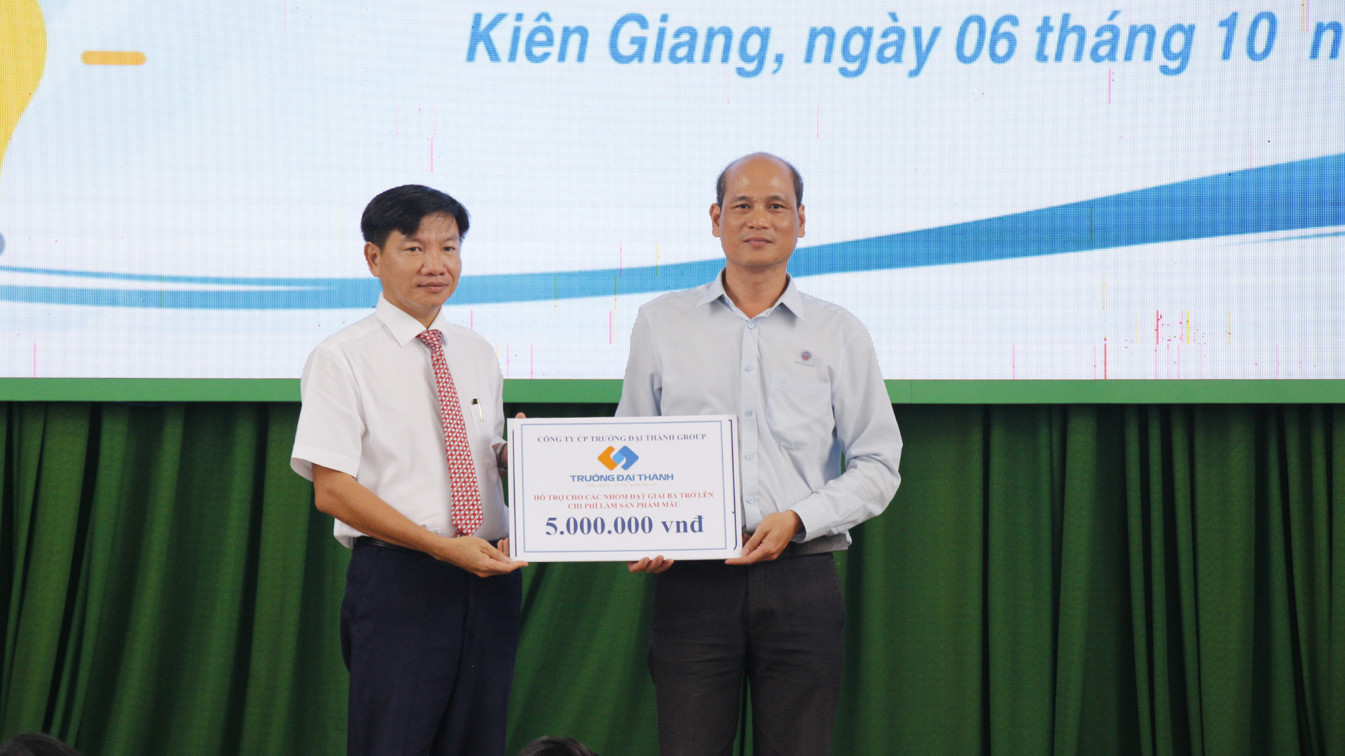 Ông Nguyễn Văn Phục - Giám đốc Công ty Cổ phần Giáo dục Hiền Nhân trao biểu trưng tài trợ 15.000.000đ cho hội thi.