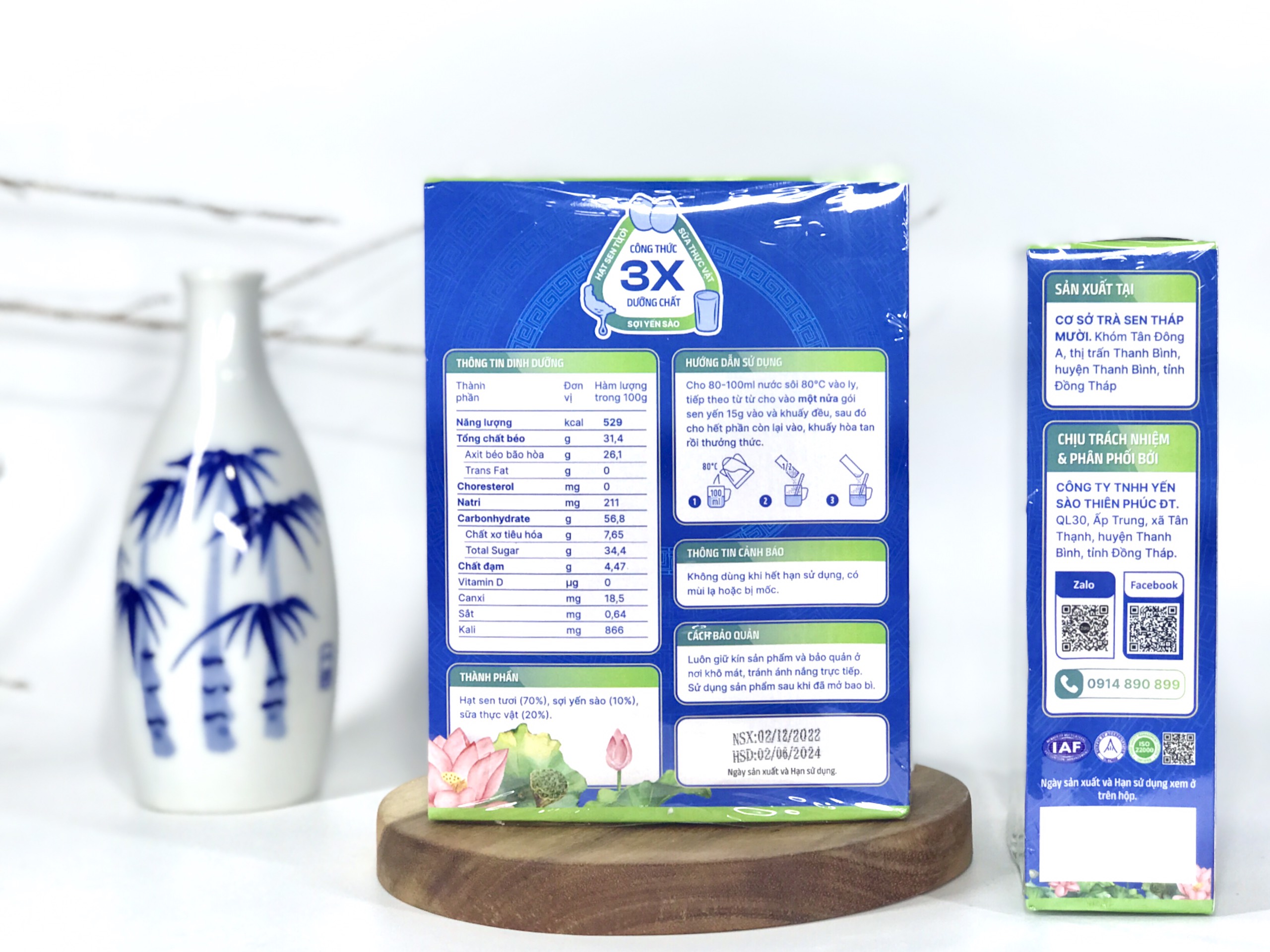 - Thành phần: Hạt sen tươi (70%), sợi yến sào (10%), sữa thực vật (20%)