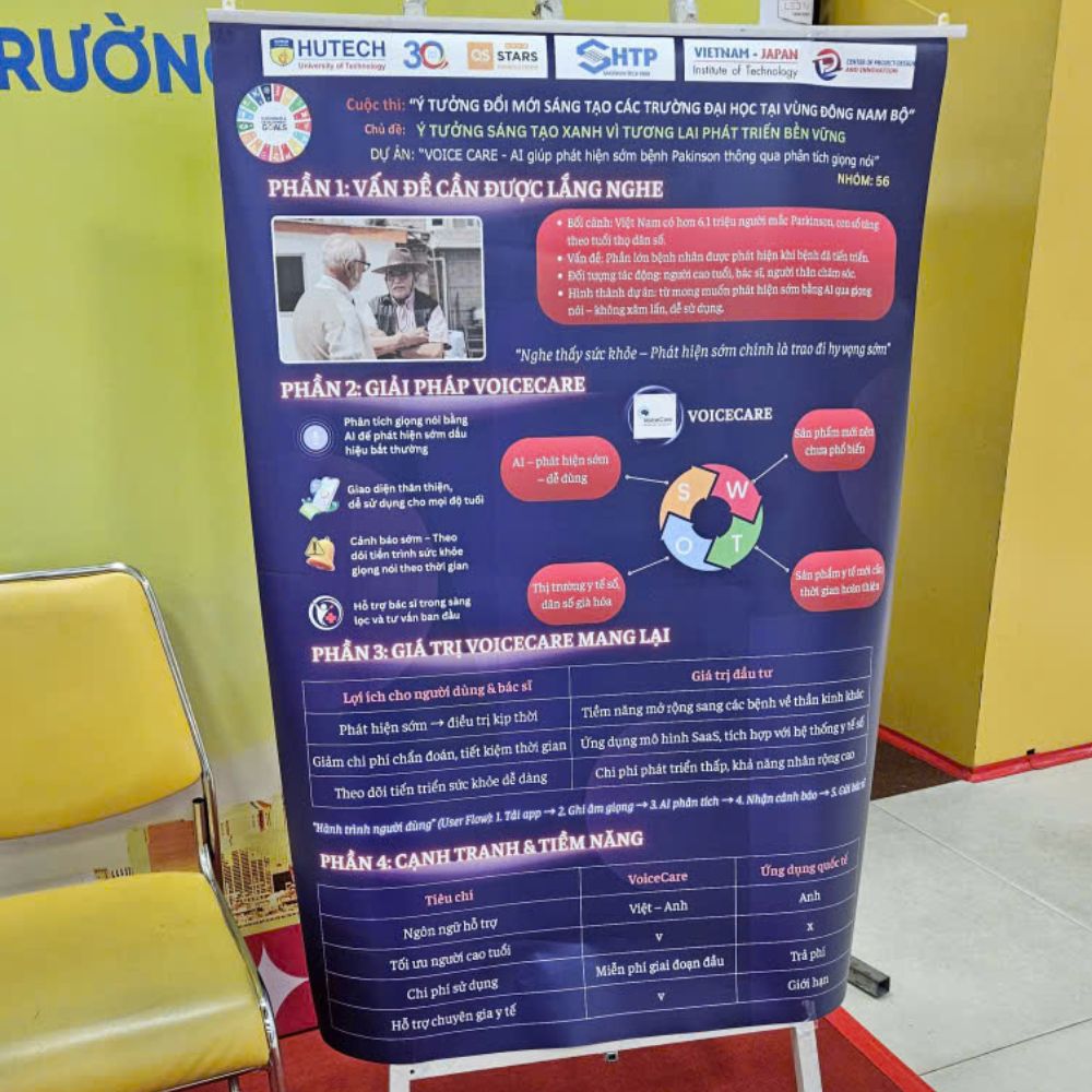 VoiceCare là giải pháp ứng dụng AI phân tích giọng nói để phát hiện sớm nguy cơ bệnh Parkinson chỉ qua điện thoại, không cần thiết bị y tế phức tạp. Hệ thống đánh giá rung giọng, độ ổn định phát âm và chỉ số giọng nói đặc trưng để sàng lọc nguy cơ và hỗ trợ bác sĩ trong chẩn đoán. Giải pháp giúp người cao tuổi và gia đình chủ động theo dõi sức khỏe thần kinh một cách nhanh chóng – dễ dùng – chi phí thấp.